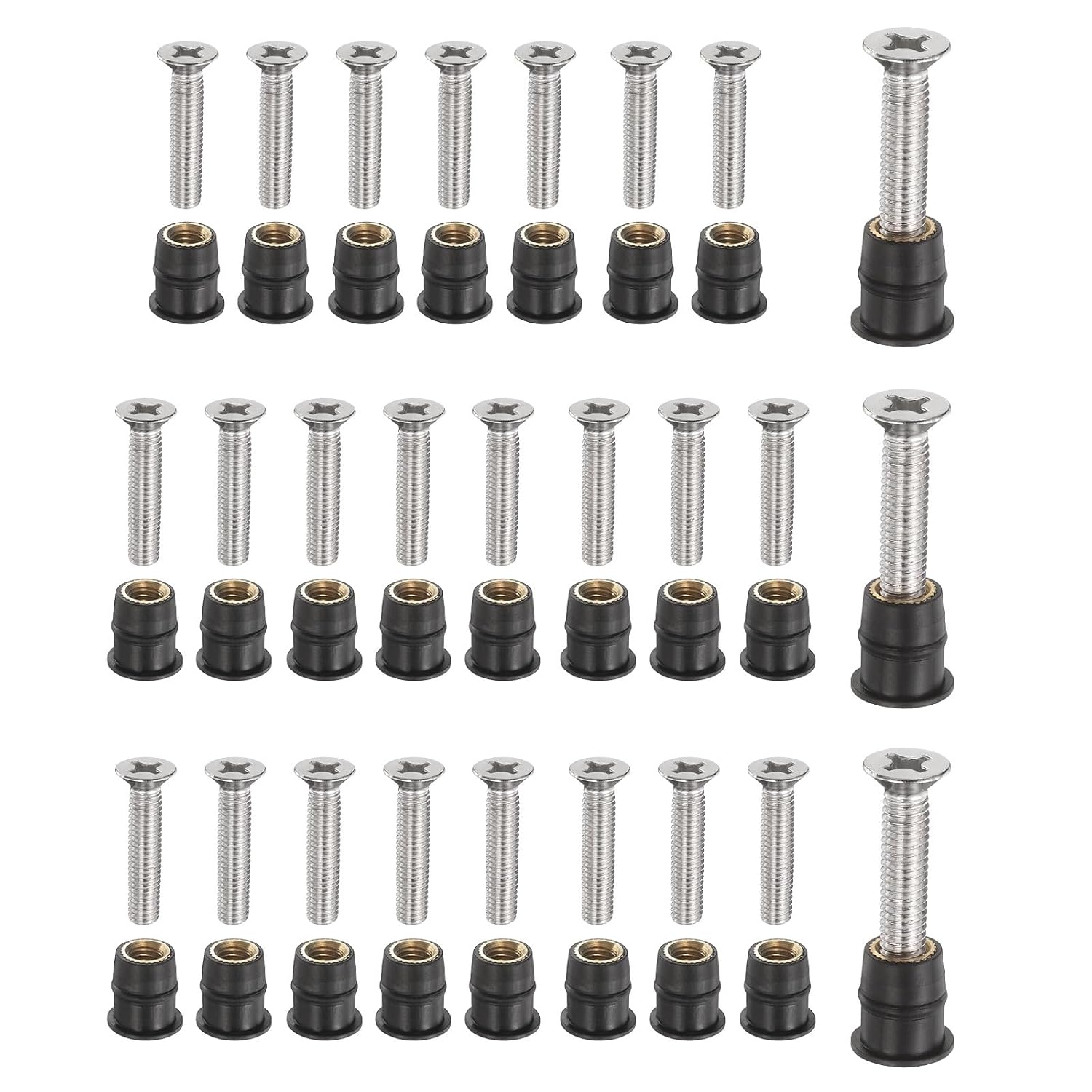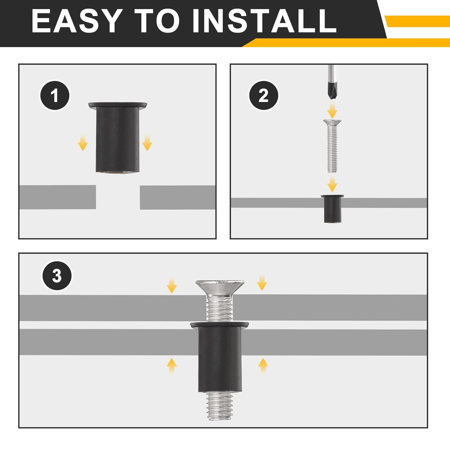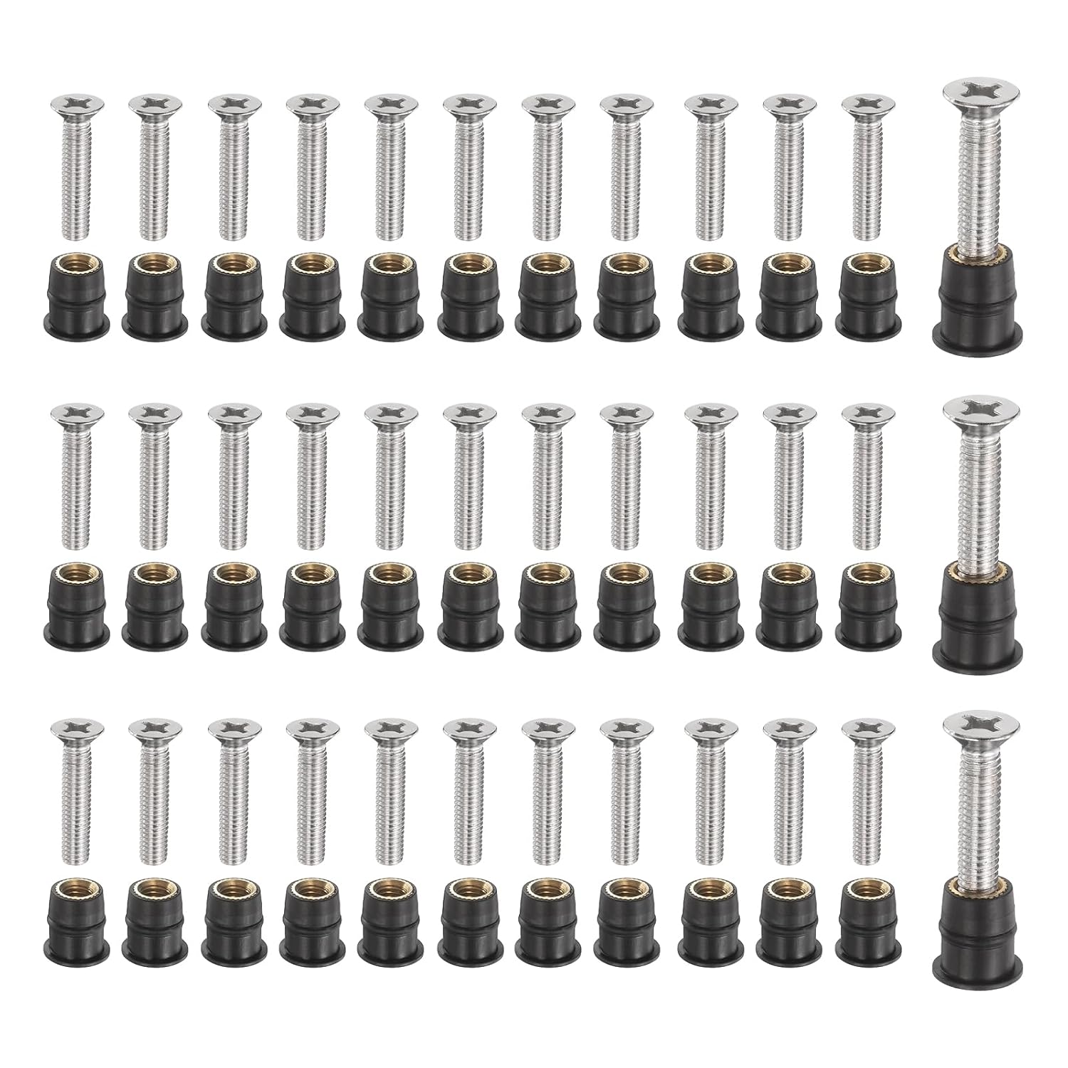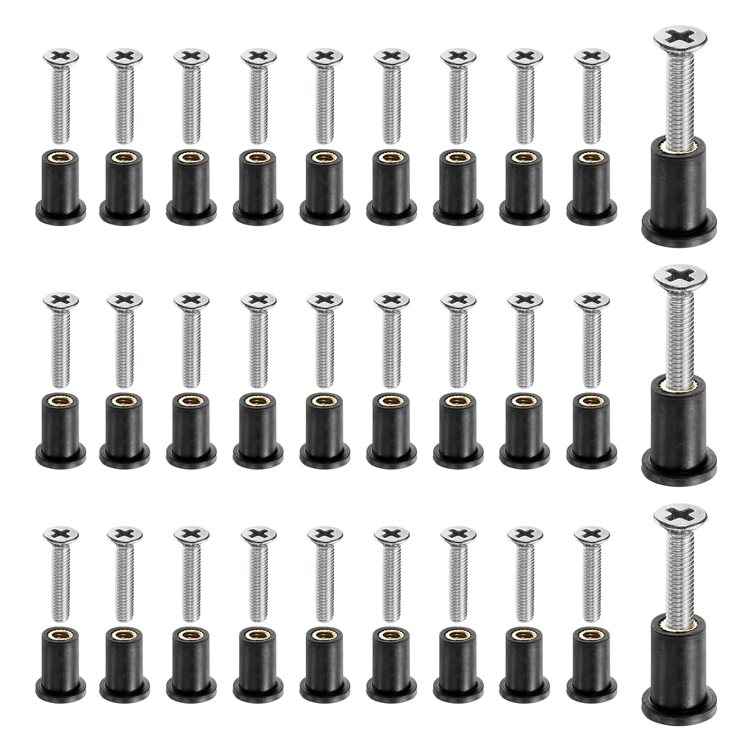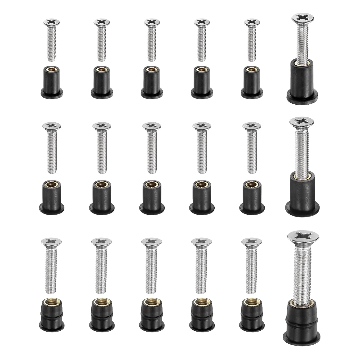 PACKAGE CONTENT: Includes 72 Pairs M4 M5 M6 rubber-faced brass nuts and stainless steel screws with matching size M4 M5 M6 stainless steel screws. Good shock absorption and impact resistance, suitable for long-term use.DURABLE MATERIALS:Nuts are made of rubber surface and brass inside; screws are made of stainless steel with excellent anti-rust and anti-corrosion properties, suitable for marine environment.APPLICATIONS: Tic-tac-nut kits are great for motorcycles, kayaks, canoes, boats and other marine or outdoor applications. Tic-tac-nuts and screws can also be used to secure plastic rectifiers and brass tic-tac-nuts are widely used in industrial and scientific applications.EASY INSTALLATION: The installation steps are simple. First, drill holes in the object to be secured, then push the nut into the hole until it is flush with the surface of the object, and finally insert the screw and tighten. Rubber well nuts are perfect for sealing holes to prevent leaks.Note: Before purchasing kayak screws, please check the required specifications.Specification Material: Rubber, Stainless SteelScrew Length: M4(20mm/0.8inch), M5(25mm/1inch), M6(30mm/1.2inch)M4 Nut Size: 8*13.3mm/0.3 x 0.5inch(Dia*L)M5 Nut Size: 9*13.3mm/ 0.35*0.5inch(Dia*L)M6 Nut Size: 10*15.6mm/ 0.39*0.6inch(Dia*L)Packing Includes: 72 Pairs x Well Nuts Kit