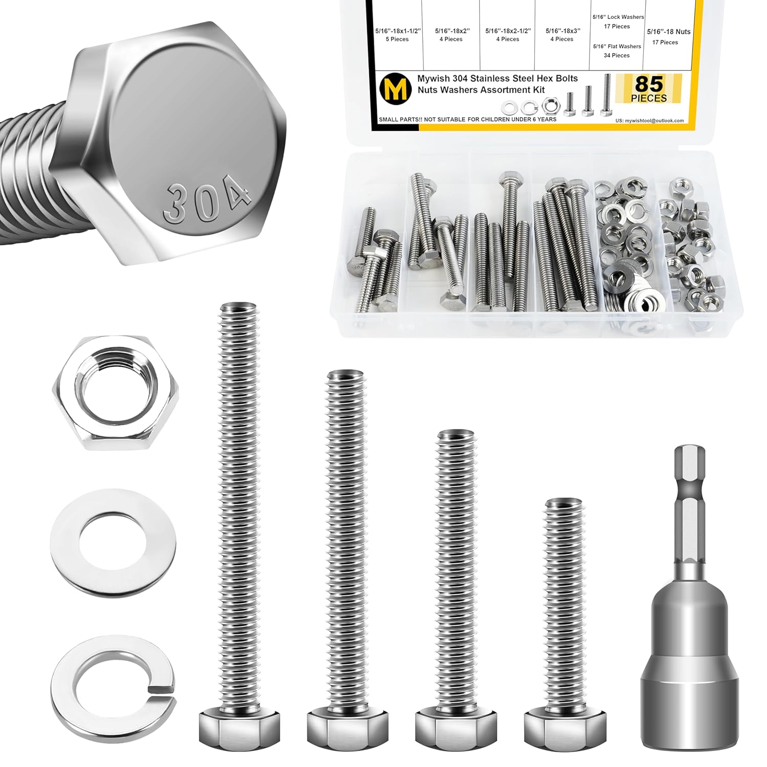 Mywish 85Pcs 5/16-18 Bolts and Nuts Kit & 750Pcs Phillips Flat Head Assorted Screws Assortment Kit, 304 Stainless Steel Bolts and Nuts Kit with Flat Spring Washers, Fully Threaded