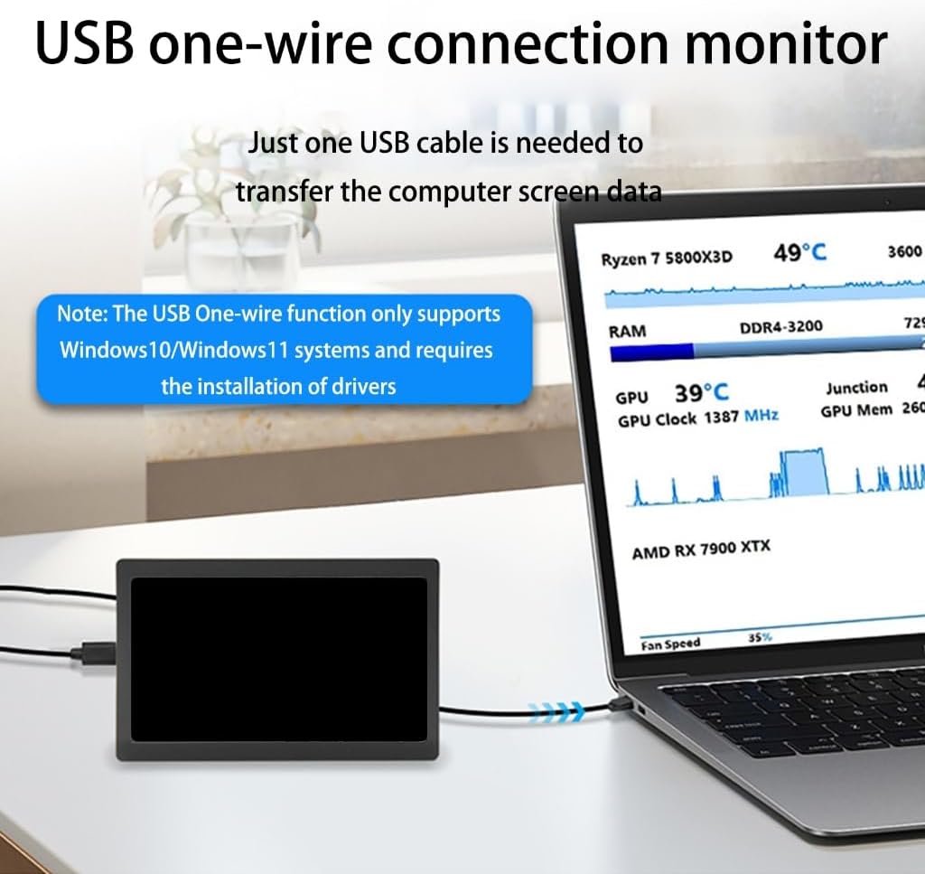 Features: seamlessly USB single cable connection for instantly secondary screen setups on systems. While transmitting data and display through single USB port. Crafted with precise machined aluminum housing, this auxiliary monitor features rounded edges, and integrated brightness memory for friendly customization. Ideal for PC enthusiasts creating chassis mounted systems dashboards and industrial technicians requiring portable screens during field operations. This USB power secondary screen delivers cost effective multiple application flexibility for both consumer PC builds and professional equipment diagnostics. Specifications: Screen Size option:5inch/7inch Connection:USB Cable Resolution:1024x600 Voltages:5V For AIDA64 PC Case Secondary Screen note: Please allow 1-2cm errors due to manual measurement. Please allow for slight color differences due to different display resolution. Package Includes: 1set chassis secondary screen display