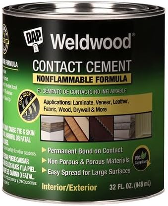 Product Description DAP Weldwood Nonflammable Contact Cement is a high solids polychloroprene, waterborne contact adhesive that meets the stringent requirements of the professional user. Complies with all current VOC requirements. Dries in 30-40 minutes, allowing for extra bonding time. Water resistant when dry. Exceeds industry performance requirements. Low odor. Easy water clean-up. From the Manufacturer High solids polychloroprene, waterborne contact adhesive that meets the stringent requirements of the professional user.