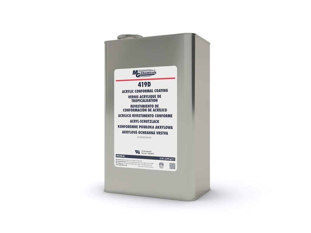 MG Chemicals 419D Acrylic Conformal Coating is fast drying, xylene and toluene free product that provides an excellent finish. This one part coating is easy to use and repair: it does not require special or costly equipment or materials. It is ideal for high moisture environments and applications requiring easy repair and rework. The 419D coating protects electric circuits against moisture, dirt, dust, thermal shocks, and scratches that could corrode, short circuit, or otherwise damage the electric components. It insulates against high-voltage arcing, shorts, and static discharges. As well, this coating provides a high dielectric withstand voltage that allows traces to be put closer together helping with miniaturization.