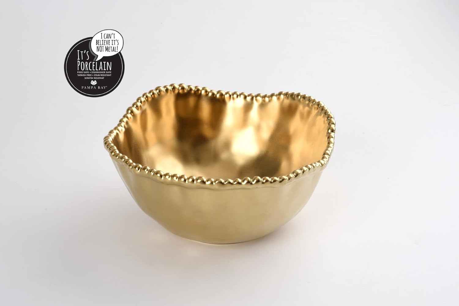 I can’t believe it’s not metal! it’s porcelain. Medium Salad Bowl in Monte Carlo. Ideal for serving tasty side dishes like steamed vegetables, mashed potatoes, or salad. Crafted in a luxurious matte gold-toned high-fired porcelain with gold beads. Food safe. Dishwasher safe. Oven safe 500°F. Easy Care.