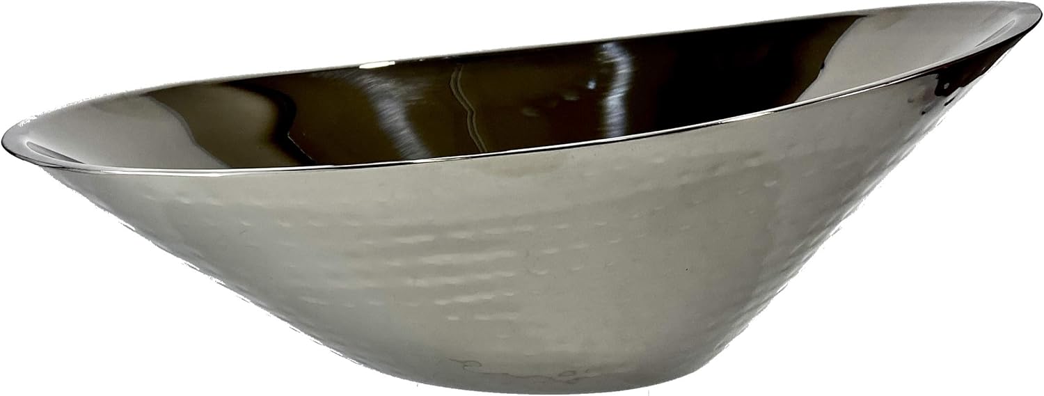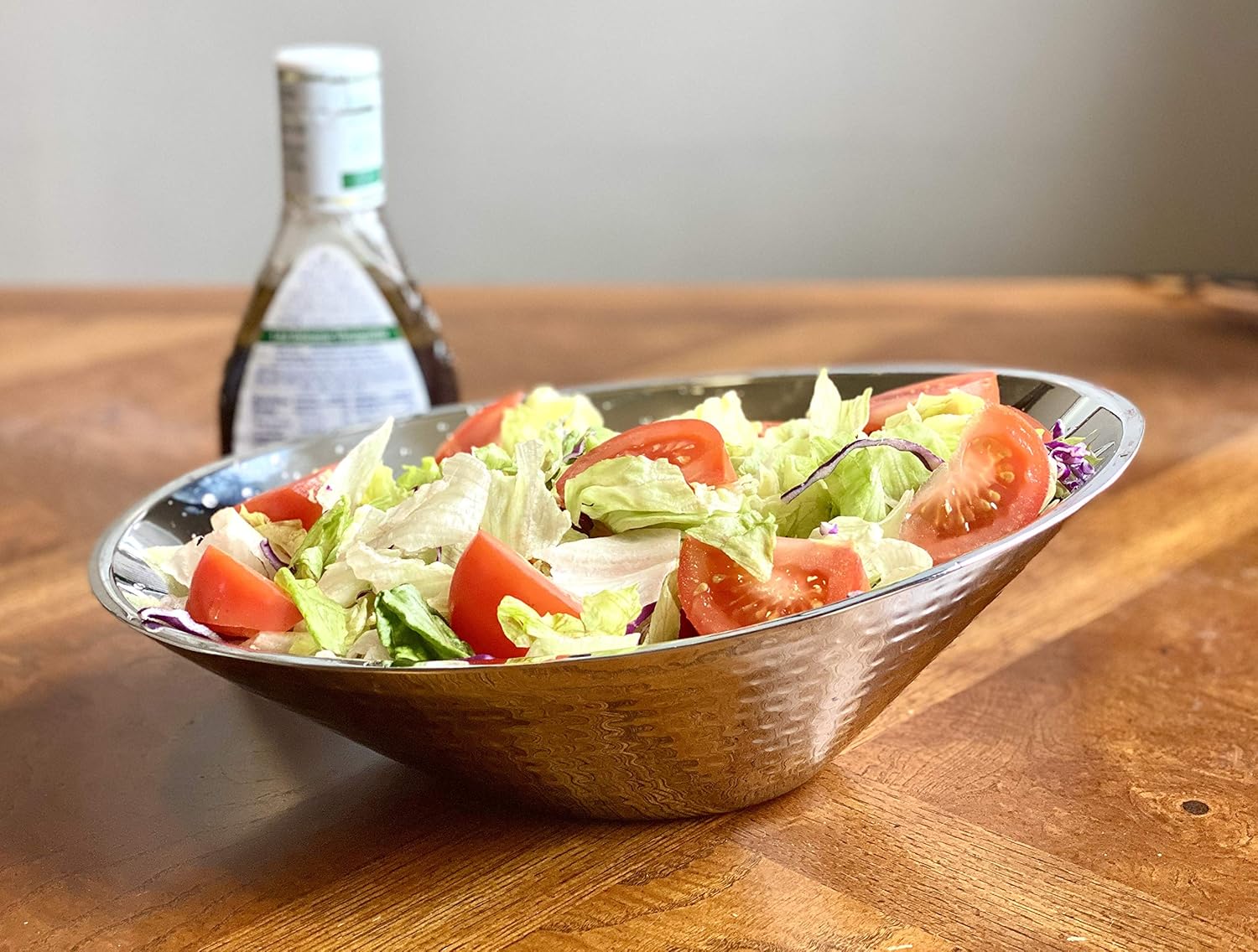 Features. Square shaped serving bowl. Material - Stainless steel. Polished exterior. Double wall insulation keeps food cold for longer. Ideal for serving salad fruit and more. Dishwasher safe. Shape - Oval. Dimension - 9.84 x 9.84 x 5.12 in.