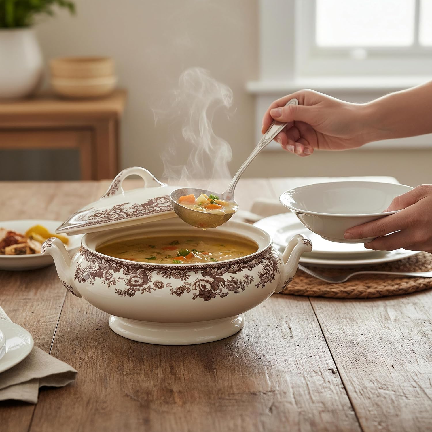Elevate your table setting with the Spode Delamere Covered Vegetable Dish, a refined piece of porcelain serveware that blends practicality with traditional elegance. Part of Spode’s cherished Delamere collection, this covered dish showcases the intricate British Flowers pattern, drawn from the brand’s historic archives. Its delicate floral design enhances both formal occasions and everyday family meals, making it a versatile choice for your kitchen and dining room. Designed for multiple uses, this covered serving bowl is perfect for presenting hot vegetables, stews, casseroles, and side dishes. The generous 6.9"H x 12.2"W x 9.4"D dimensions allow for ample portions, while the matching lid helps maintain food warmth and flavor throughout your meal. Crafted from durable porcelain, this dish combines lasting strength with timeless beauty, ensuring it remains a staple on your dining table. Convenience meets elegance with this multi-functional piece, as it is dishwasher safe, microwave safe, freezer safe, and oven safe, offering unmatched versatility. Whether you’re preparing meals ahead of time, reheating in the microwave, or presenting straight from the oven, this serving dish adapts effortlessly to your needs. The Spode Delamere vegetable server is more than just functional—it is a statement piece of heritage tableware. It makes an excellent choice for holiday entertaining, weddings, anniversaries, or as a thoughtful gift for loved ones. Enhance your dining experience with this exquisite piece of porcelain serveware that seamlessly blends tradition with everyday practicality.