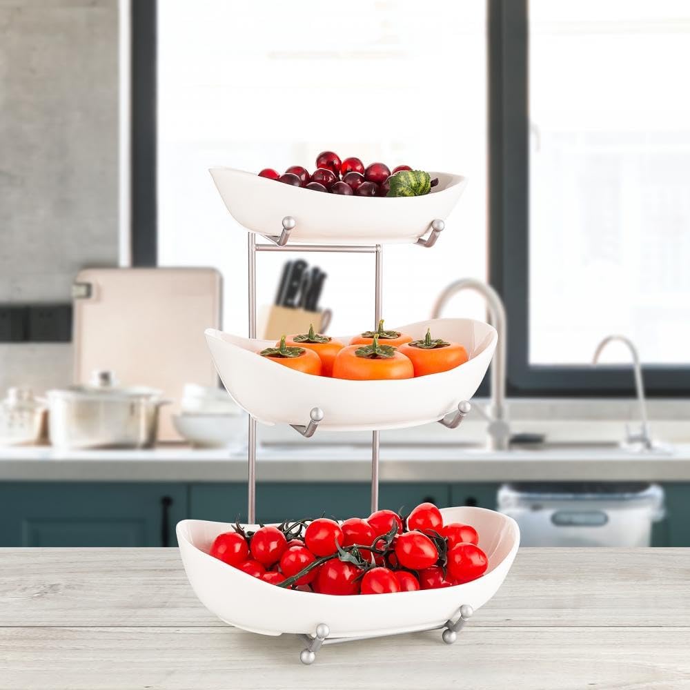 Welcome to our store Our aim is to provide the best products and services for you to make your life more comfortable and convenience.Unique Design The countertop fruit stand combines aesthetics and practicality, with a three-layer design that is unique and clever, with an elegant style. It is not only a plate for fruits, cakes, and desserts, but also an elegant decoration for your sweet home, suitable for restaurant or table decoration.Ceramic Material This exquisite fruit bowl is made of high-quality ceramic, with a smooth and textured surface. The bracket is made of stainless steel material, and the metal bracket has good stability and decoration. A white fruit bowl can match well with your desktop or kitchen counter.3 Tier Fruit Basket The fruit rack is very suitable for storing and displaying fruits, nuts, desserts, snacks, salads, etc. It can provide sufficient storage space for food. The fruit tray can also be used alone. It is very suitable for family dinners, food displays, parties and holiday housewarming gifts.Dishwasher safety Ceramic fruit bowl can be used in microwave ovens, dishwashers, disinfection cabinets, refrigerators and steamers. Scald-proof, non-slip and easy to clean.Packing: 1 x 3 Tier Fruit BasketAttention 1.Chromatic aberration existed due to different display setting. 2.There may be 1-3mm differences as manual measurement. 3.Because it is a ceramic product, it is normal for a slight flaw on the bottom of the bowl.