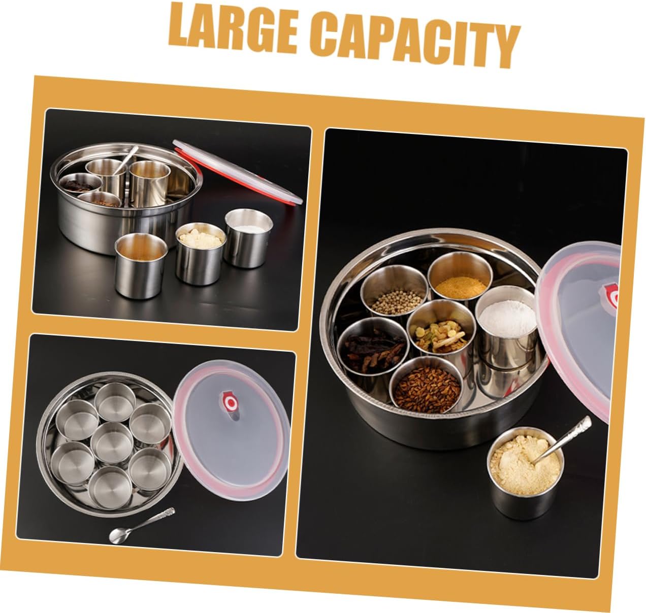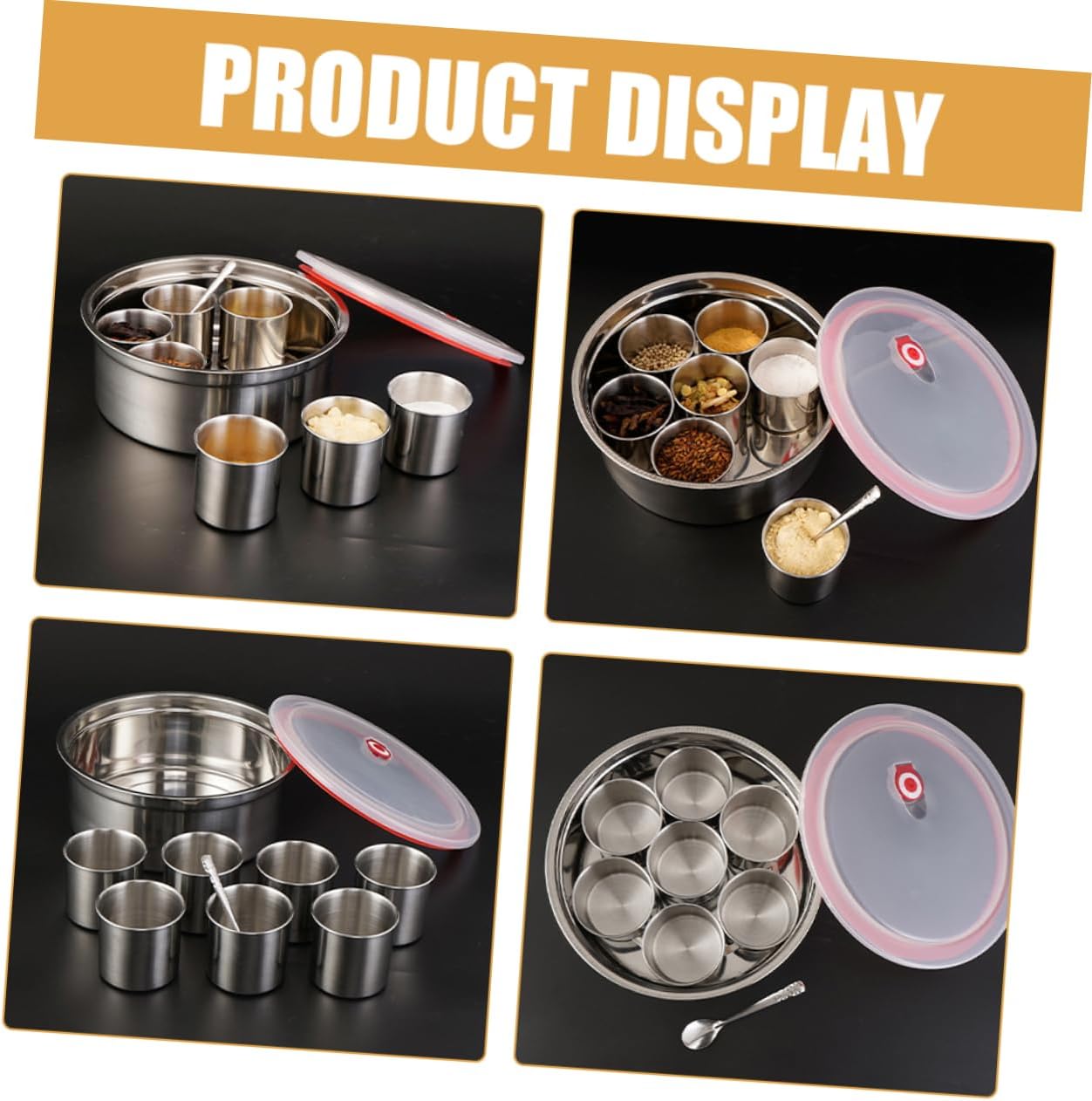 Package List 1 x Set of Stainless Steel Spice Container Features -Material: Stainless steel dressing bottles -Size:25.00X25.00X9.50cm/9.82X9.82X3.73in kitchen canisters for countertop -Small cup: 7.5x7cm canisters for kitchen counter -Color:Assorted Color seasonings set -Stack storage, save kitchen space, stretch arc corner easy to accommodate, easy to take bottle -The seasoning canister is very easy to use or storage by the small size design, practical and simple to operate stainless steel containers. -Suitable for storage of various seasonings, making delicious food simpler and more convenient stainless steel seasoning canister -Can also be used outdoors, carry very convenient, this holder is also a countertop decorations kitchen seasoning jar -It has a wide range of applications and is suitable for home kitchens, restaurants, hotels and other places containersGoods Descriptioncondiment jar The enough capacity design is reasonable and easy to use, can bring more convenience to your cooking work.multifunctional jar This seasoning storage canister is in simple and beautiful design, which can help you store different kinds of seasoning, make your kitchen look more comfortable and tidy