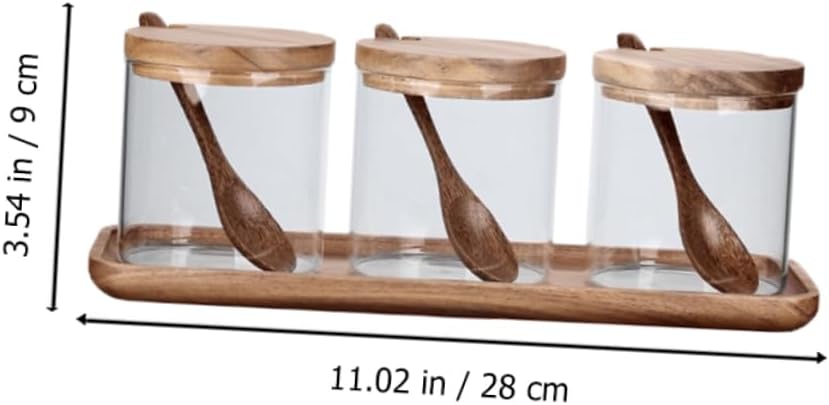 Package List 3 x Seasoning Jars with Lids 3 x Spoons 1 x Tray Characteristics -Color: As Shown Seasoning Canister -Size: 28.00X10.50X9.00cm/11.00X4.13X3.54in Glass Condiment Jar -Material: Wood, Glass Clear Seasoning Jar -Great for storing salt, pepper powder, paprika, sugar and other condiments Seasonings Jar. -Made of sturdy glass and wood material, which is and convenient for use Small Seasoning Pot. -Simple but fashionable, fits kitchen, decorating your cooking and dining environment Salt Container. -Unique design of seasoning jar will bring some fun to your cooking time Set Kitchen Supplies. -Multi-functional seasoning storage jar, creative and for home use Seasoning Jar.Goods DescriptionGlass Condiment Jar This item a multipurpose seasoning storage jar, made of glass and wood material for to use.Glass Condiment Storage Jar You can store salt, pepper, spice and other condiments.Clear Spice Jar Keep your kitchen neat and in order with these seasoning jar.Clear Seasoning Jar Suitable for home, hotel, restaurant, etc