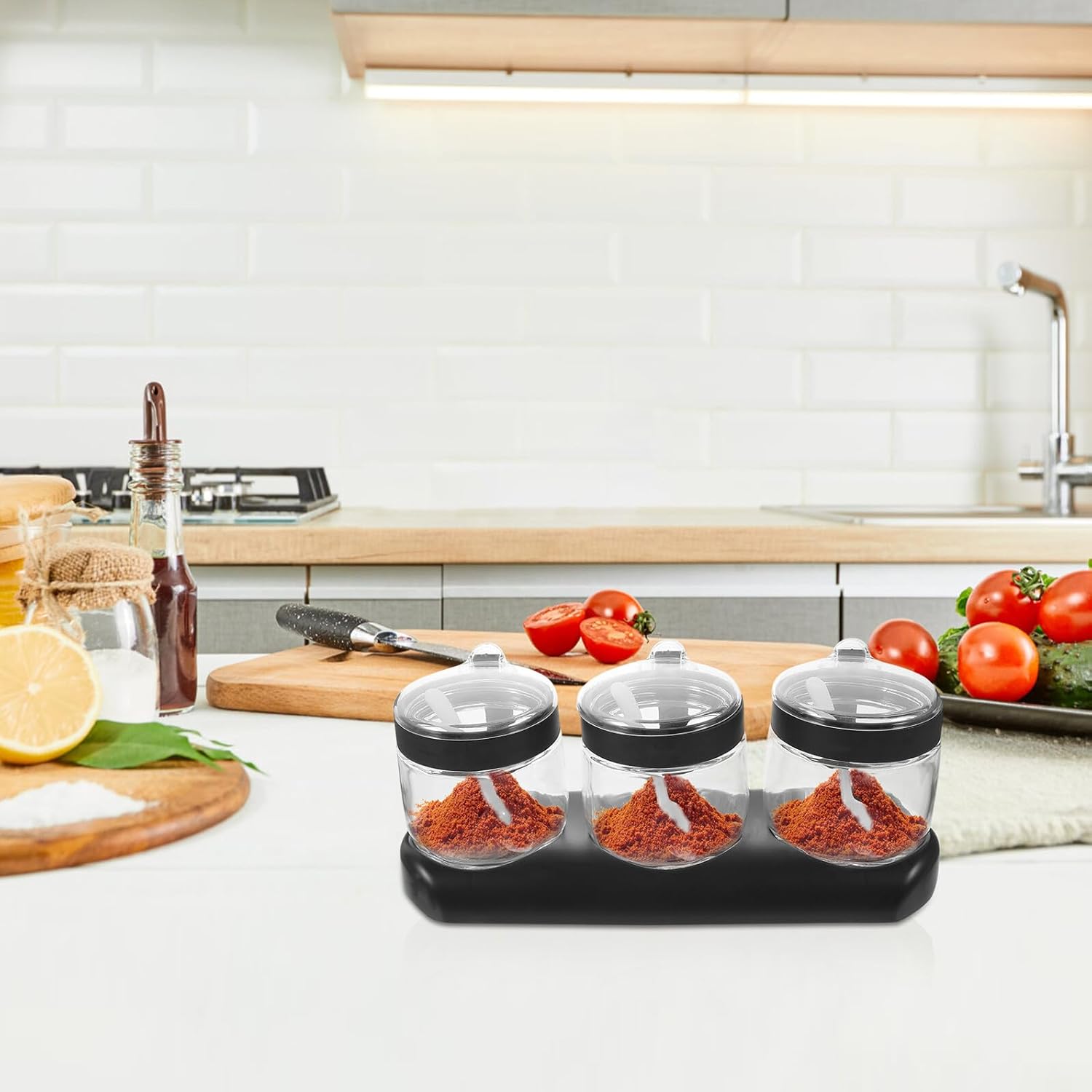 Package List 3 x Spice Jars 1 3 x Spoons Characteristics -Material:Glass, PP and - Size: 30.50X11.50X2.50cm/11.99X4.52X0.98in -Product Info:Seasoning bottle set -Note: The volume of each spice container is 350 ml transparent spice jar. - Color: Black -It has a wide range of uses, it can be used by yourself or as a to friends and relatives countertop seasoning containers. -These Spice Bottles are practical accessories for your home use, and they can be applied for restaurants, hotels, also good for barbecue, camping, etc glass seasoning containers. -Clear bottle , which can make you distinguish the type of seasonings easily and allow you to check the remaining amount of the condiments household seasoning container. -These practical Seasoning Bottles are definitely a must-have for the family. It can store your supplies and keep your kitchen tidy and glass seasoning jars. -Well selected for use and use. Suitable for storing different seasonings, easy and convenient for cooking.Goods Informationglass containers for salt This is a small Seasoning Storage Bottle designed with lid.multi spice container The glass Seasoning Container is designed with a transparent bottle, which can make you distinguish the type of seasonings easily and allow you to check the remaining amount of the condiments, bringing of conveniences for you