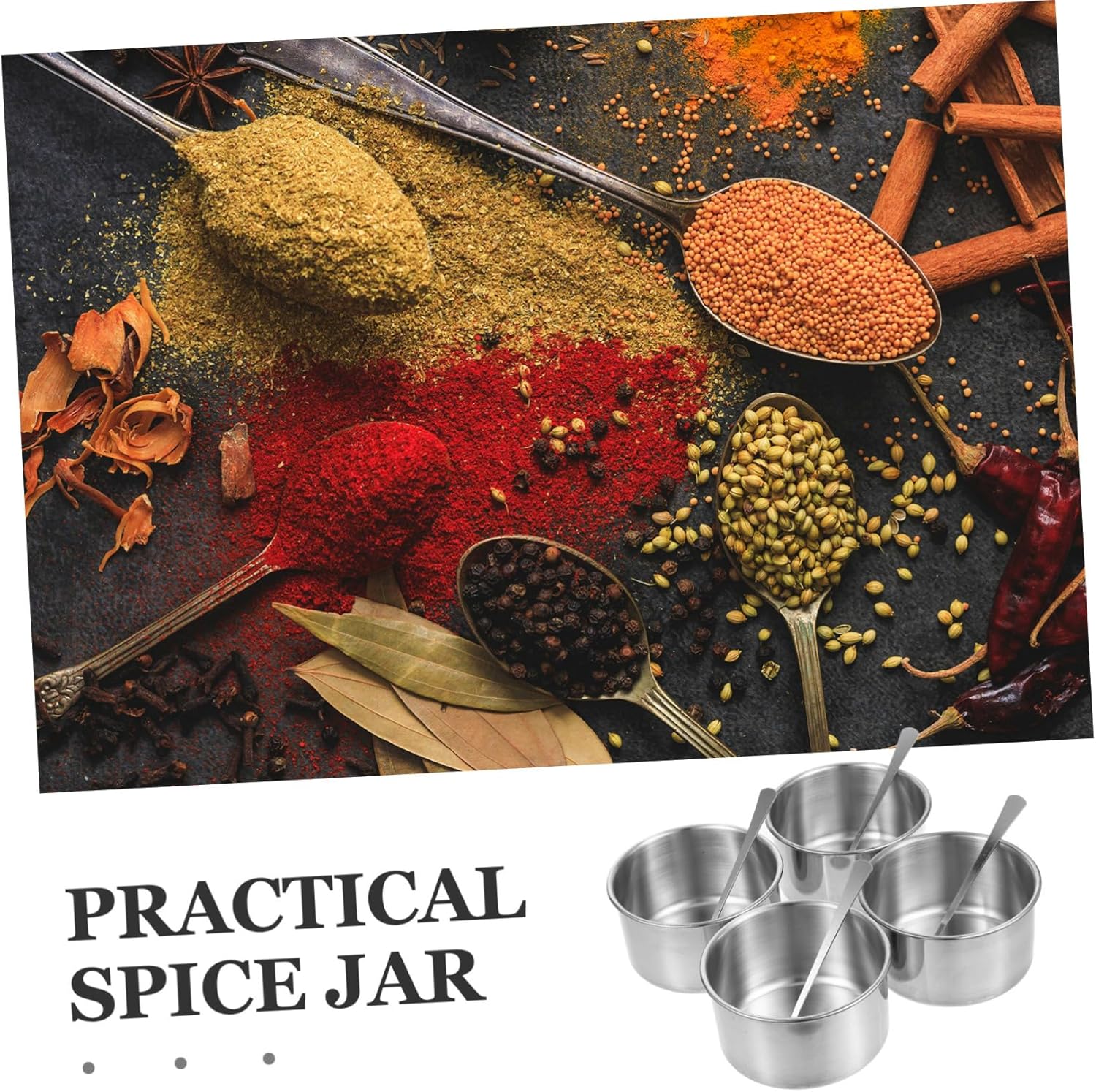 Package Include 1 x tray with lid 4 x spice jar 4 x spoons Characteristics -Color:Silver condiment case -Material:201 stainless steel spice box -Size:10.00X10.00X5.50cm/3.93X3.93X2.16in condiment box -Size:22.00X22.00X6.00cm/8.65X8.65X2.36in kitchen condiment jar -Made from stainless steel material, this seasoning container is built to last, ensuring long-lasting use in the kitchen sugar holder. -Detachable seasoning jar set for easy cleaning and seasoning change condiment container for kitchen. -Can help you better store and organize kitchen spices by the large capacity, making it more convenient for you to use condiment case with lids. -Its compact size and tray design make it easy to store and access seasonings, providing convenience in the kitchen spice holder. -The sleek and modern design of this stainless steel seasoning container with cover adds touch of elegance to kitchen stainless steel sugar container.Goods Informationcontainers with lids Make your kitchen in order and bring you more convenience, save time and efforts.seasoning jar Still worried about the messy condiment in the kitchen? Why not try our multi-functional and professional kitchen seasoning jar? Made of stainless steel material, it can serve you for a long period of time
