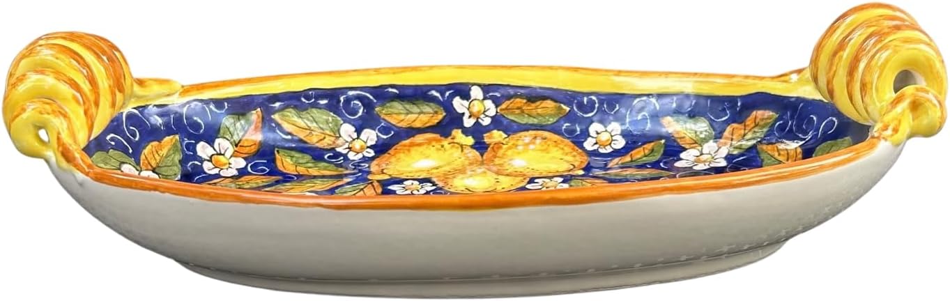 THE TOTAL PRICE INCLUDES CUSTOMS DUTY TAX PRODUCT INFORMATIONCeramic bowl for any use , or small centerpice for table.Decoration: Collection three lemons ; Composition of three lemons , leaves, flowers and curls, on a blue background, yellow/orange borderDimensions: (14,56 Inch) x (8,26 inch)PRODUCT INSTRUCTIONSAll our products are lead-free and can be used for foods . Dishwasher safe Do not use in microwave Do not use in oven