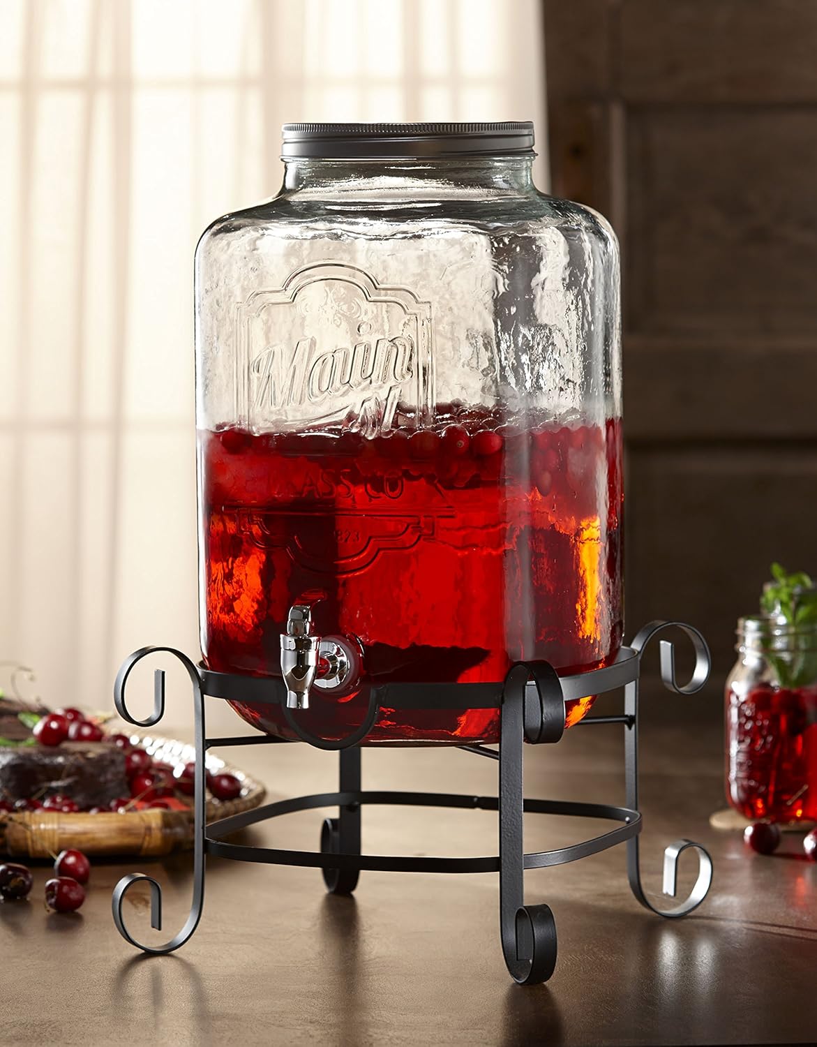 This classy Style Setter Main Street beverage dispenser set with stand comes with one glass container and a metal stand to keep them standing high for your drink serving needs. The stylish stand looks amazing, but is functional too. It's positioned high enough that you can pour your drink from the stand without dangling the container's spout over the edge of a table. This timeless beverage dispenser is made with elegant crystalline that will last for years to come.