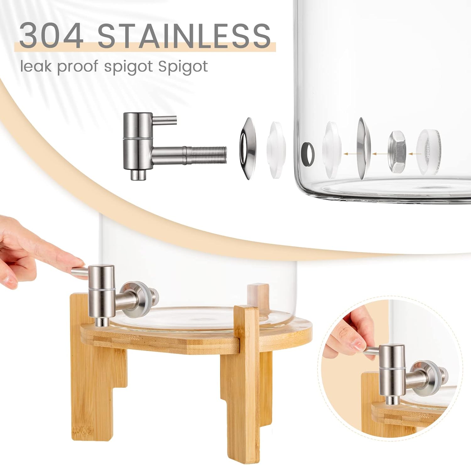 Features: Functional designs: A wooden lid lined with silicone seals the liquid inside, which helps keep the beverage clean and prevents spillage during transport. The included metal faucet is easy to install on the jar. Hot or cold drinks: This gallon dispenser is made of quality glass with a metal spigot and the sturdy glass jug is very temperature resistant, which is an ideal gift to send for holding both cold and warm drinks, like ice tea, lemonade, cocktails, hot cider, mulled wine and more. Specifications: Main material: glass, stainless steel, silicone and bamboo wood Color: as pictures shown Size: Beverage barrel: approx. 7.87 x 9.84 inches/ 20 x 25 cm Wooden frame: approx. 3.94 inches/ 10 cm in height Package includes: 1 x Beverage dispenser with spigot and stand Notes: Manual measurement, please allow slight errors on size. The color may exist a slight difference due to different screen displays.