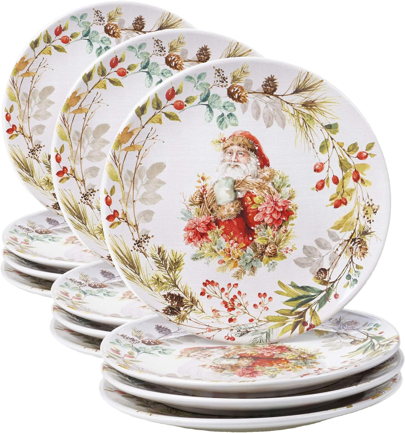 Bring the warmth of the holidays to your table with this enchanting set of Santa-themed Christmas dinner plates. Each 11-inch ceramic plate features a nostalgic depiction of Santa Claus at the center, framed by a wreath of pinecones, winter berries, and delicate evergreen branches. The detailed artwork evokes the charm of classic Christmases, making each meal feel like a festive celebration. Whether you’re serving a holiday roast, pasta, or a cozy winter stew, these plates add magic to every bite. Made from high-quality ceramic, they are both microwave and dishwasher safe for effortless entertaining. Their elegant yet sturdy construction ensures they’ll become a cherished part of your seasonal tradition. Perfect for family dinners, holiday parties, or simply embracing the joy of the season, this plate set makes a thoughtful gift and a stunning addition to any Christmas collection.
