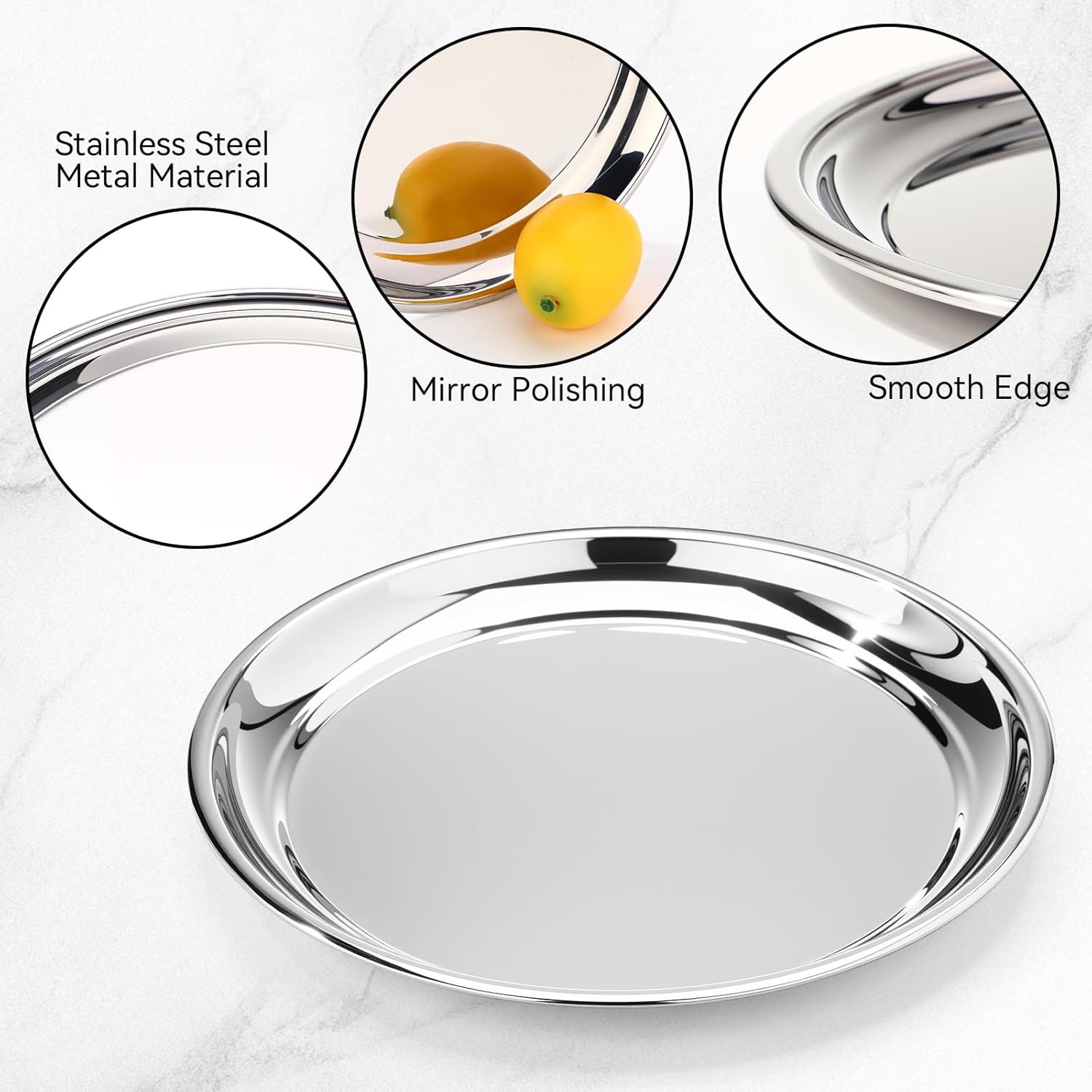 Features: Easy to store: The flat and stackable design of the mirror silver tray platter can be easily stored in the kitchen cabinet or pantry, and it will not take up too much space, which is convenient for daily use and storage Widely applications: The mirror stainless trays is very suitable for daily use at home, not too heavy, in addition, it is also suitable for camping, gatherings, parties, gifts and other occasions. Specifications: Material: stainless steel Color: silver Size: about 10 inch in diameter Package includes: 8 x Round silver mirror decorative metal serving trays Notes: Manual measurement, please allow slight errors on size. The color may exist a slight difference due to different screen displays