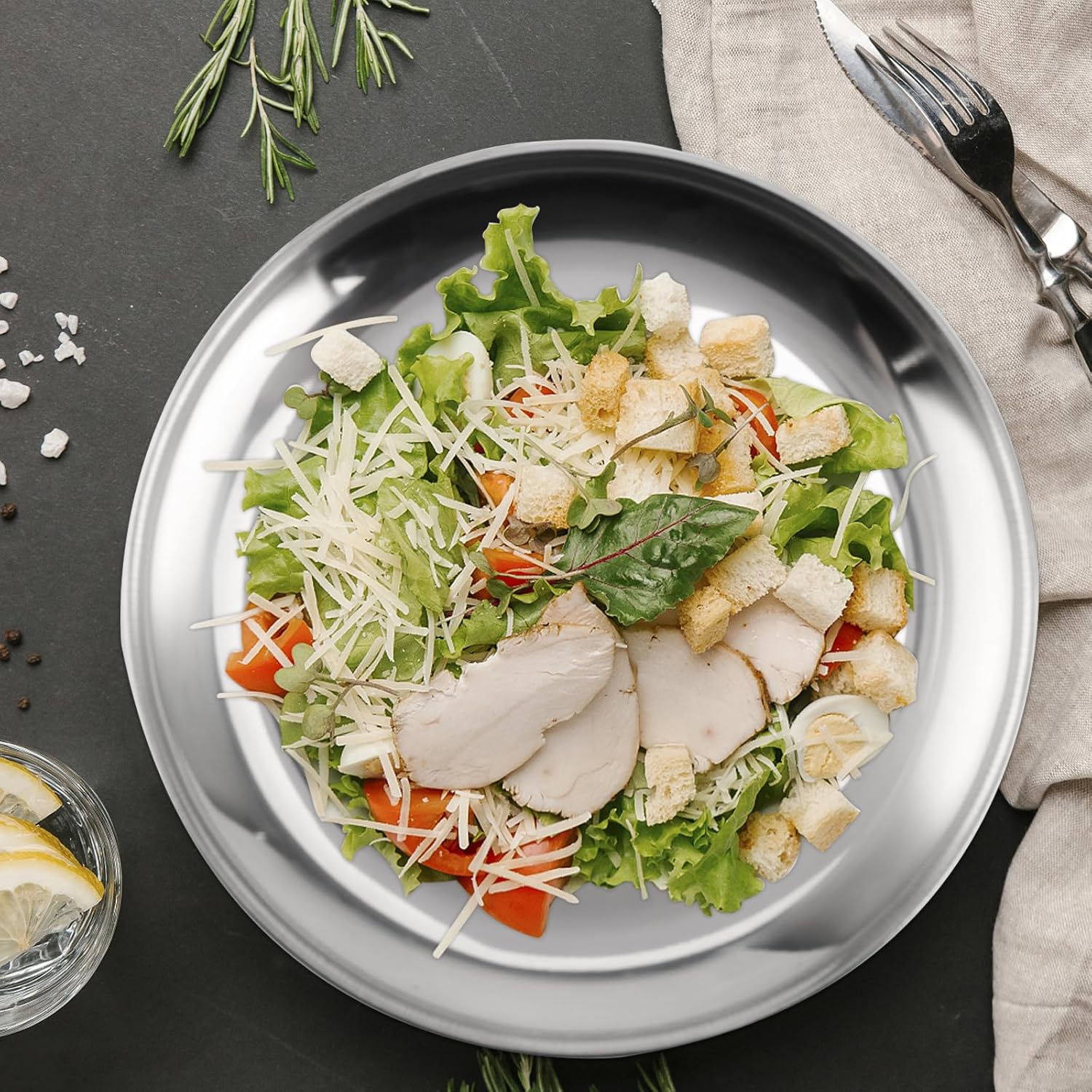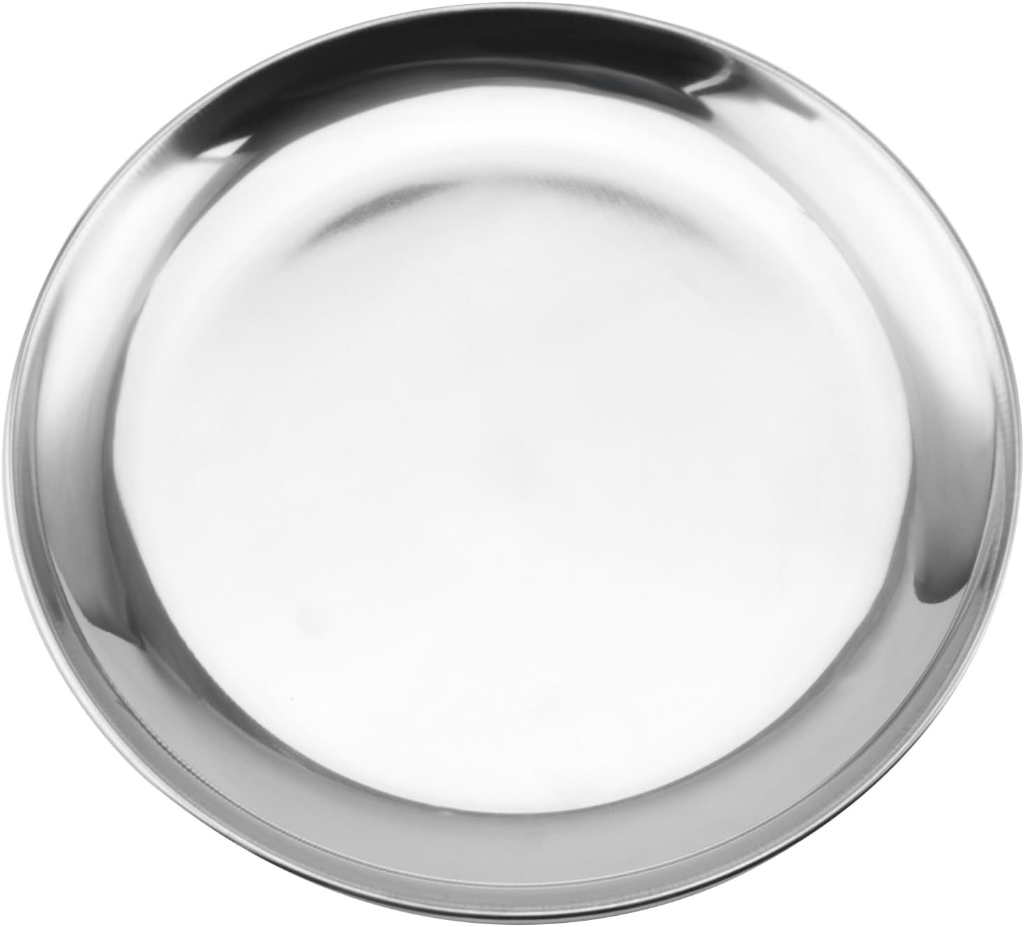 ABOUT MOUYATWe are aware that the after-sale service is the key to determine the brand loyalty of the customers. Give it a try at MOUYAT! We have perfect after-sales service and professional customer service, making your purchase worry-free! What are the features of this product?1. These stainless steel camping dishes are strong, and thick enough to prevent being popped back and forth. 2. Easy stacking 12 inch metal round plate in the cupboard or dish rack. They look nice, aren’t flimsy, and wash well. 3. Also there's a lip where they've rolled the metal over on the edges, and it collects water when cleaning the plates. 4. Perfect stainless steel round plate for a family platter. For a jewelry tray, candle holder, etc., it’s quite cute, as well. SPECIFICATIONS:Material: Stainless Steel Size: 12 x 0.6 inch Color: Silver WHAT YOU GET:6 x Stainless Steel Round Plates