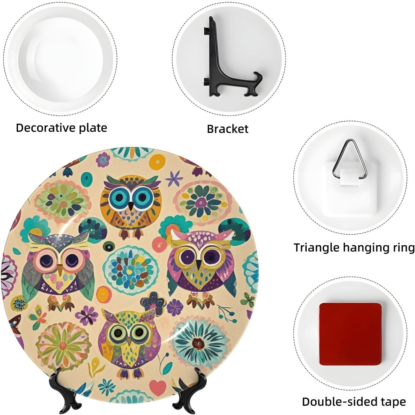gokays decorative platedo you feel that your table is monotonous? Then use our decorative plate to add a little fun to the monotony of life.featuressize - 6 inch diameter;7 inch diameter;8 inch diameter;10 inch diametermaterial - ceramic design - Color owl pattern package - 1 x ceramic decorative plate, 1 x stand, 1 x pothookwhy choose gokays decorative plates?advantageas manufacturers we follow current trends and bring you the latest home fashion. Salad plates ideal for placement at home or in the office. Traditional porcelain making technology, fine workmanship. Ceramic dinner plates is a good gift for family and friends.convenient to useour dinner plates rack for display has 2 ways to use, you can just place the bracket base on a flat surface first, and then put the plate on it, also you can stick the provided pothook at the back of the plate, and then stick the plate on the wall, you can choose the suitable installation method according to the actual situation.occasionour ceramic ornaments salad plates is a perfect decorative and collection for any niche, table, or mantle at your home. Perfect for your office, home, living room, dining room, playroom, kitchen, cafe, study, studio, club, bar, and others.in a surprise for your family and friends!porcelain dessert plates is a perfect gift for any person in your life. You can give it directly to your lover as mother's day gift/father's day gift/birthday gift/christmas gift/valentines day gift/anniversary gift/wedding gift/housewarming gift/new home gift.start with our funny decorative plate, refresh your rooms!