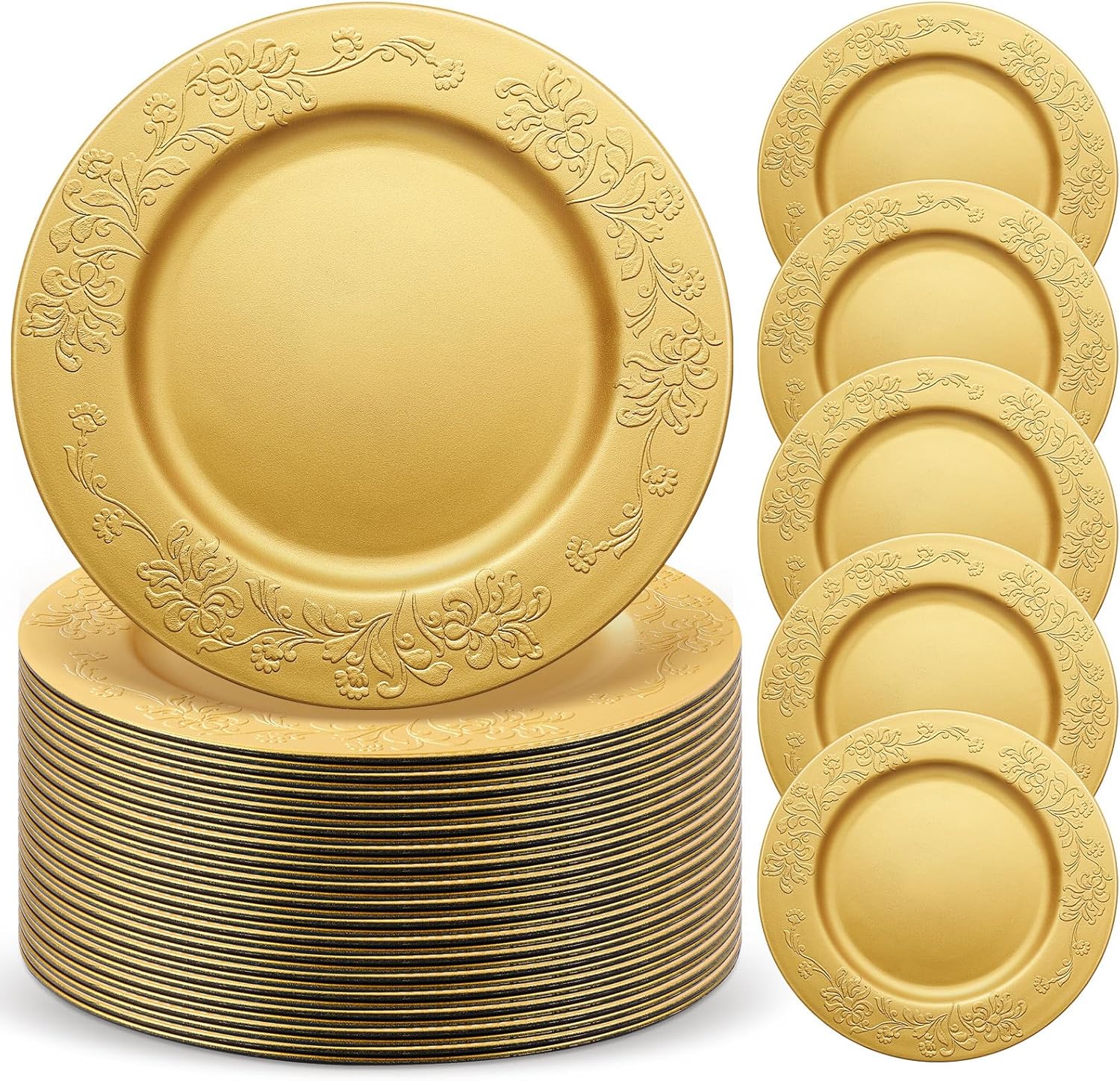 Features: Each round charger plate features a sophisticated ring pattern, bringing a touch of elegance that complements any decoration theme. The gold chargers bulk can be applied in daily life, travel, camping, picnic, barbecue or other activities, adding more charms to your dining table Specifications: Material: plastic Color: gold Size: about 13 inches/ 33 cm in diameter Package includes: 50 x Gold charger plates Notes: Manual measurement, please allow slight errors on size. The color may exist a slight difference due to different screen displays.