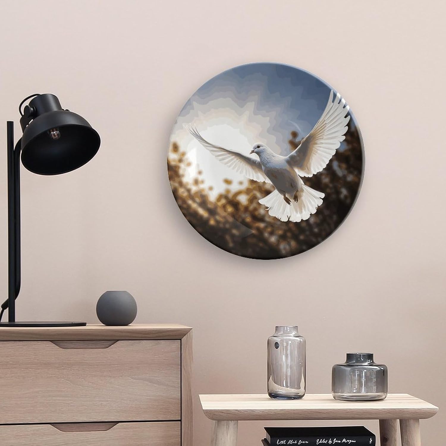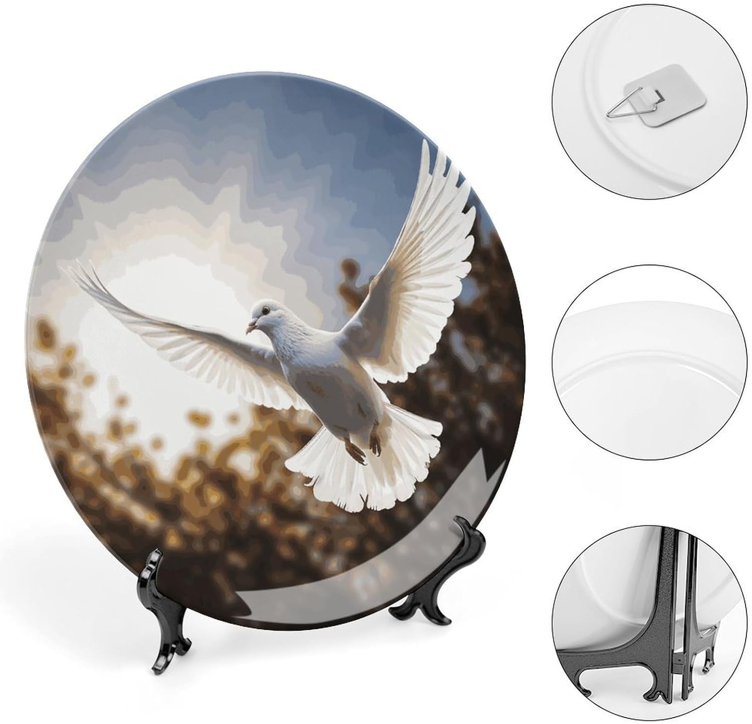 High Quality Material: Made from high-quality ceramic, this plate is not only visually stunning but strong enough for everyday use. Its smooth surface ensures easy maintenance and long-lasting appeal.Appeal: This White Dove Flying in The Sun bone china plate has a traditional design and is a statement piece. It's a great addition to your dinnerware collection or a beautiful addition to your home.The ceramic plate can be placed three-dimensionally with its base on the table or hung.The diy patterns are vibrant and suitable for most office or home decor, living rooms, tables, kitchens, shelves, dinner parties, housewarmings, vacations, weddings, restaurants, florists, spas and other special occasions. It comes with a display stand and is sturdy, versatile, stylish and safe for everyone to use. Quality plates stand out and give their owners confidence and aesthetic taste.