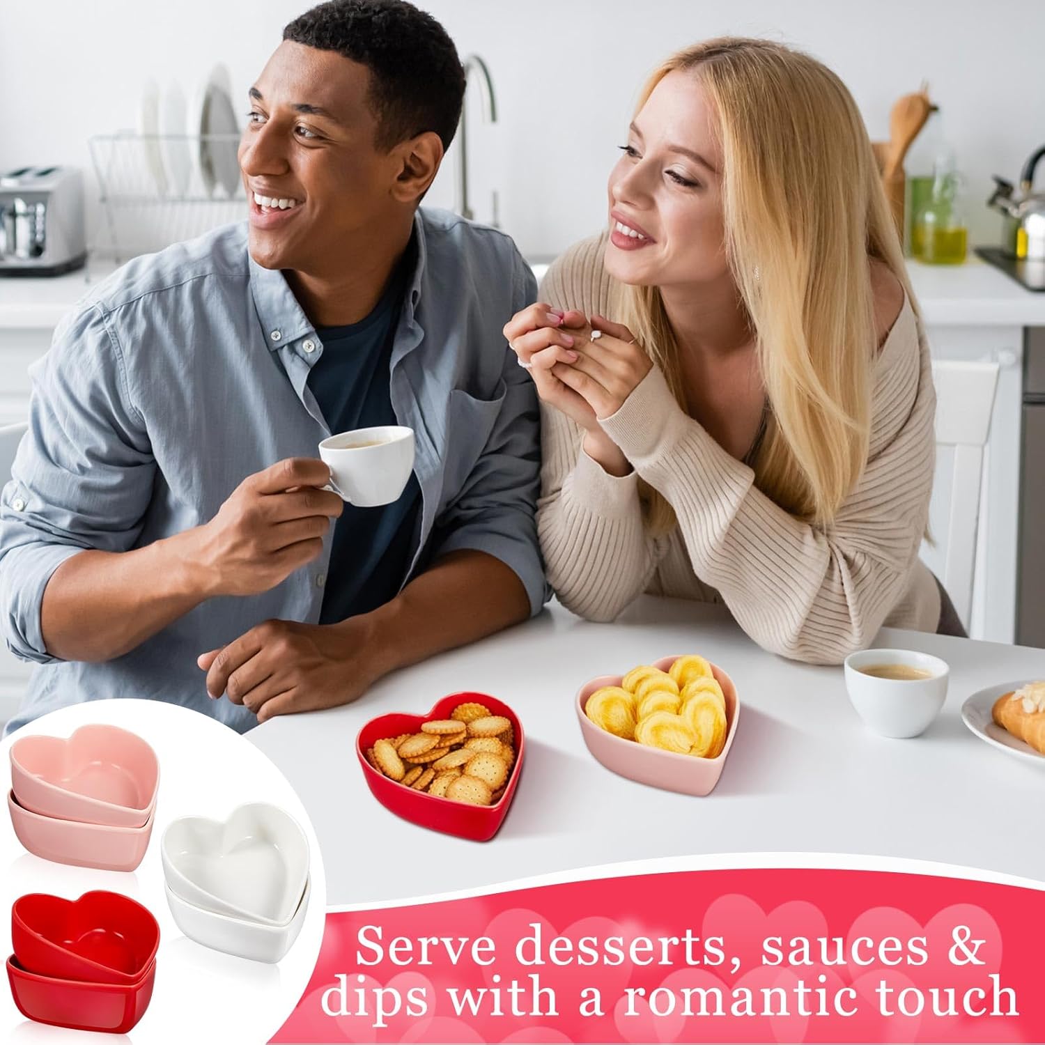 Features: The design of these bowls features a classic heart shape that adds a touch of warmth to your table. Available in three colors—pink, red, and white—they offer a choice to match different decors or occasions. The heart motif is particularly fitting for Valentine's gifts, adding a sentimental touch to kitchen cooking and dining. Their aesthetic appeal makes them a charming addition to your home. Specifications: Material: ceramic Color: red, pink, white Size: The capacity is 8.5 oz/ 250 ml The diameter approximately 4.5 inches/ 11.4 cm Package includes: 2 x Red heart shaped bowls 2 x Pink heart shaped bowls 2 x White heart shaped bowls Notes: Manual measurement, please allow slight errors on size. The color may exist a slight difference due to different screen displays Dishwasher and microwave safe