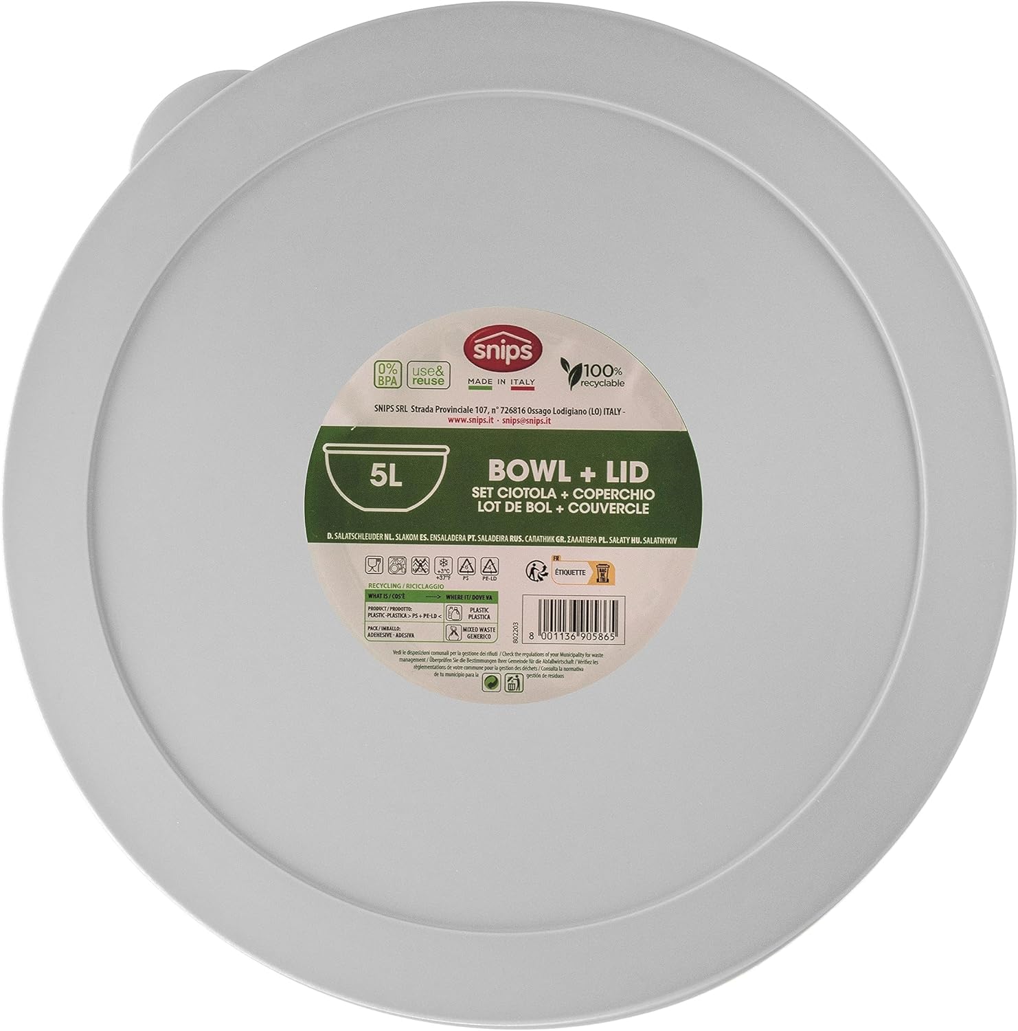 Item Type Name Snips Salad Bowl White Salad Bowl Salad Bowl with Lid 5 Litres Made in Italy Bpa Free