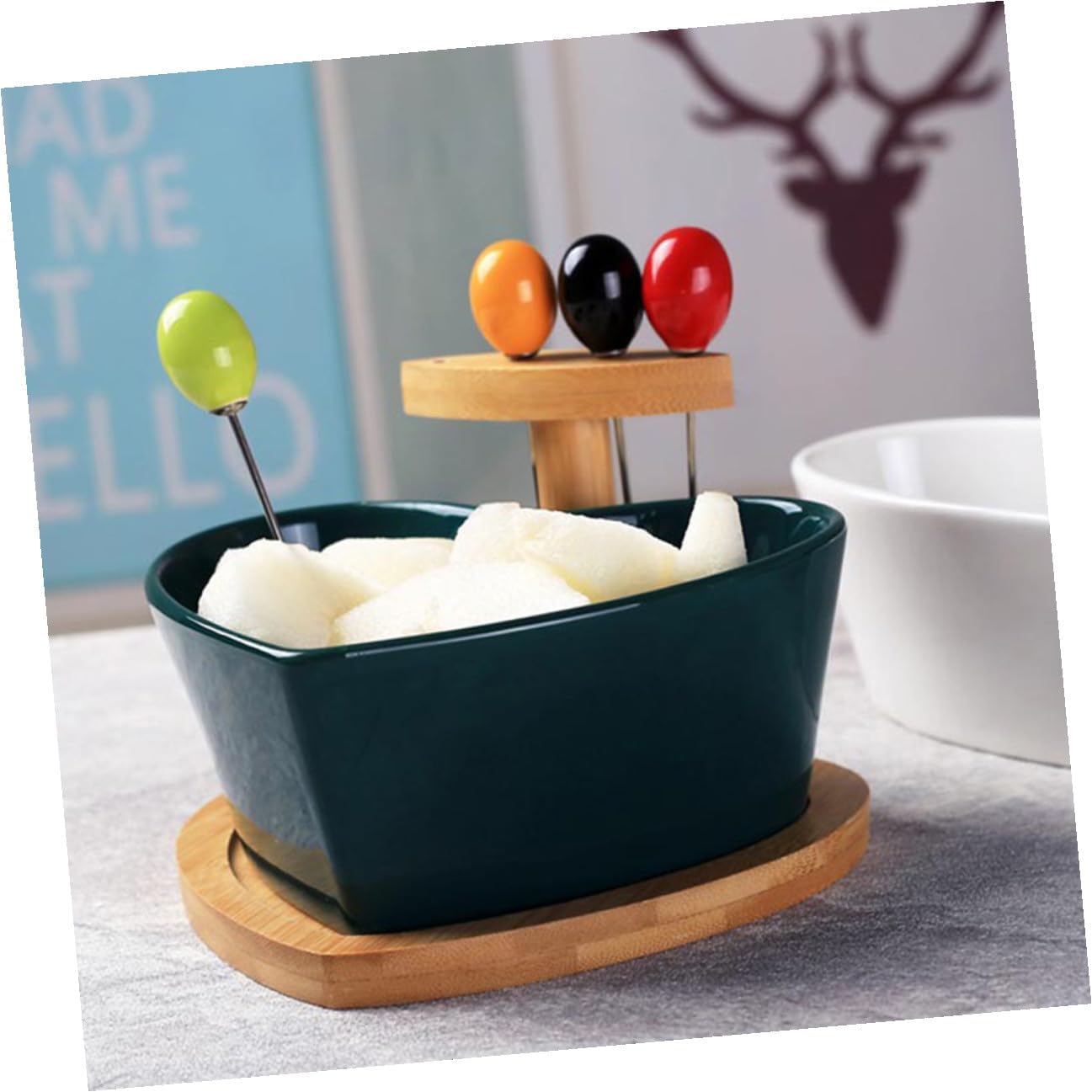 Package Include 1 x Bowl 1 x Stand 4 x Forks Characteristics -Material: Ceramic Wooden -Product Info:Fruit Bowl - The plate is made of ceramics material, so they are safe for your health. - The wooden tray is easy to move the salad bowl, and can protect the table from being scalded when the ceramic tableware is holding hot food Household Tableware. - Perfect for appetizers, chips, sweets, fruits and vegetables, dips and hot food Salad Bowl with Forks. - With 4 colorful metal forks, it is very suitable for sharing food with friends and family. - Creative salad plate is lovely and fashionable enough for dinner, parties and casual gathering for everyday use Dessert Bowl.Goods InformationCeramics Salad Plate Its heart shape design makes it looks beautiful, perfect for a variety of foods.Dessert Bowl This is a heart shape salad bowl, which is great as salad plate, dessert plate and as vegetable plate.Food Serving Plate Natural modern design, premium ceramics material will showcase your favorite foods