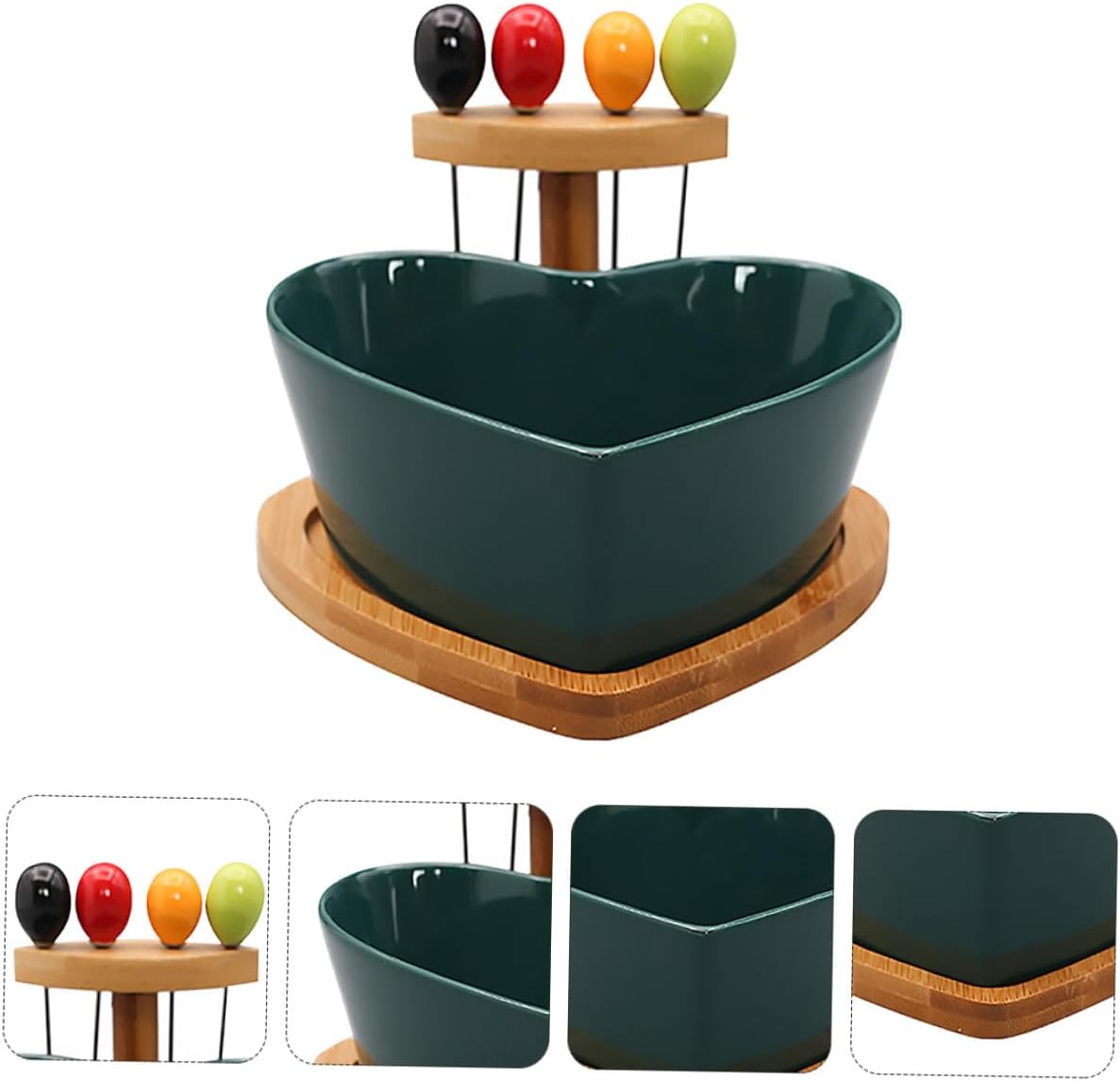 Package Include 1 x Bowl 1 x Stand 4 x Forks Features -Size: 16x16x10.5cm/6.29x6.29x4.13in -Material: Ceramic Wooden -Product Info:Fruit Bowl - Perfect use for any type of food such as layered desserts, appetizers, fruit salads and much more Fruits Bowl. - This creative bowl for fruit could be your perfect decor in your kitchen countertop, table or other places Porcelain Serving Dish. - Elegant design brings you a good mood and enjoys delicious food, a perfect gift for your friends and family Dessert Bowl. - Made from premium ceramics material, natural, safe and practical. - Fine workmanship and beautiful appearance, its popularity and utility Fruit Bowl.Goods InformationFruit Bowl Heart shaped brim design with detail makes it stylish and attractive.Ceramic Bowl with Fork Great for any types of foods such as desserts, appetizers, fruit salads and much more.Heart Shape Salad Bowl This item is a creative fruit plates, which is made of material for safe and use, come with fruit forks.Fruits Bowl You will enjoy the easy and happy food time