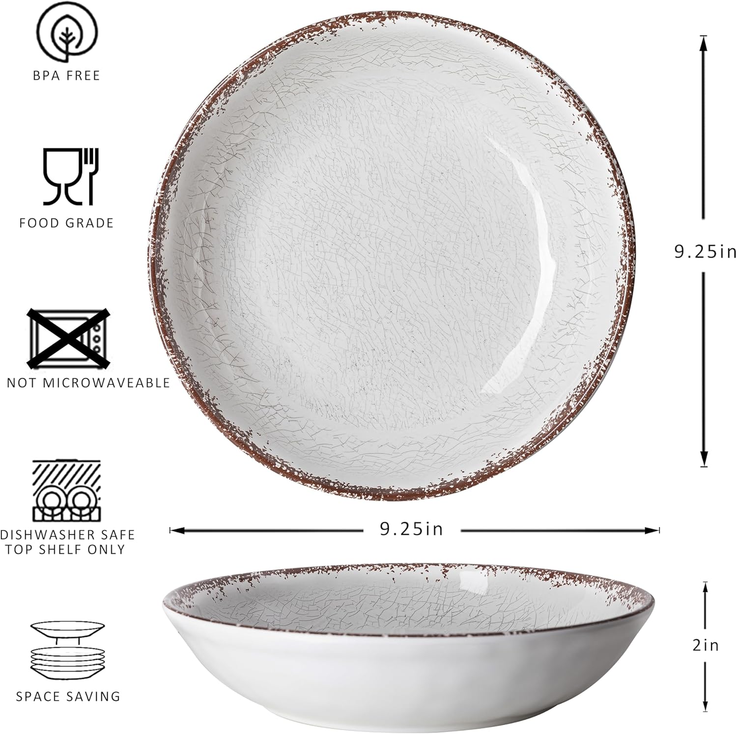 Melamine Pasta Bowls, 6 Pack 9.25 inches Large Salad Serving Bowls, Shallow Salad Bowls, Plastic Dinner Deep Plates Premium Material: Made of 100% pure melamine which is BPA free and durable Perfect Size: Pack of 6, 9.25 inches Diameter, 2 inches height. Enough large pasta bowls Dishwasher Safe: You can wash them with soap and hot water or place them into your dishwasher, do not use in the microwave Unbreakable & Durable: These LEHAHA pasta bowls are stackable and DON'T take up a lot of space in your cupboard. Versatile Use: 42 Ounce capacity is suitable for for salads, shrimp, and grits, beans, rice, pie and ice cream, etc.