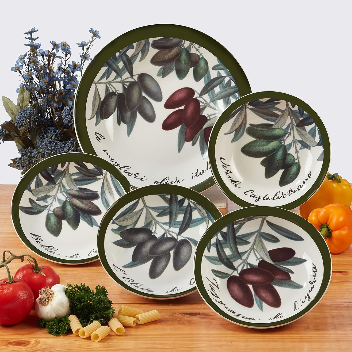Serve your favorite pasta or salads in Certified International’s Olive d ’Italia 5 pc. Pasta Set. Each bowl features beautiful images of a different olive variety and name in Italian, designed by the artist Jessica Mundo. This ceramic serving set consists of 1 pc 12.25 Dia. X 3 H Large bowl and 4 pcs. 8 Dia. X 2 H Individual bowls. Sold in an attractive gift box, great for shower, hostess or housewarming gifts.