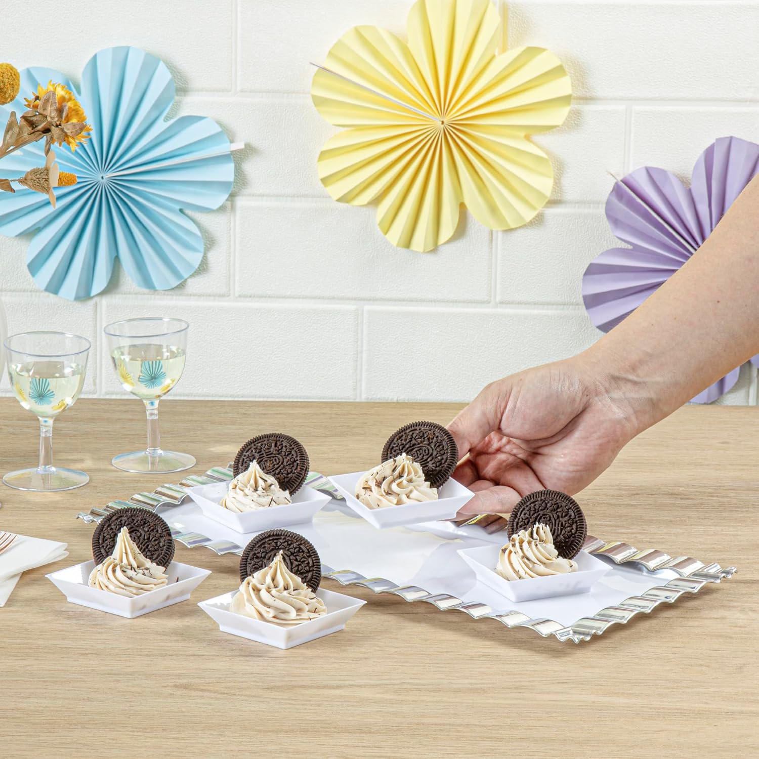 Embrace sophistication at your catered events or cocktail parties with our Mini Serve Square White Plastic Mini Modern Plates. These durably constructed square plastic plates won't chip or break, ensuring reliable use. The raised edges of these elegant disposable plates ensure your culinary presentation remains neat without any spills. The sleek white finish of these medium-sized plastic plates makes a striking backdrop for showcasing your delicious dishes. Measuring 2.5 inches in length by 2.5 inches in width, these plastic plates are perfect for serving bite-sized desserts and appetizers. Sold in a 100 count box.