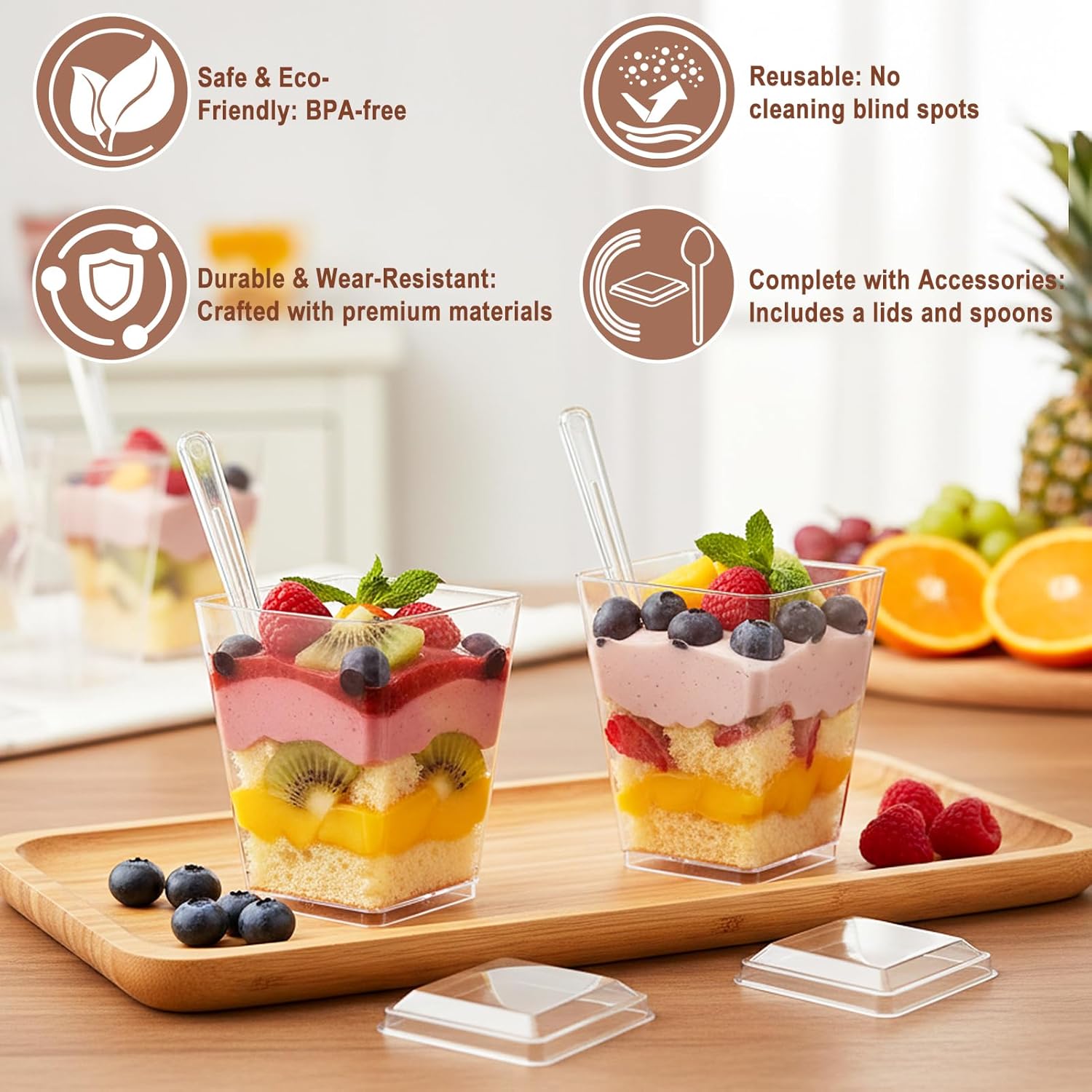 Our 5-ounce dessert cups are crafted from premium BPA-free plastic, ensuring exceptional durability and safety with virtually no risk of breakage. They are the perfect choice for serving cakes, mousses, ice cream, puddings, yogurt, fruit, and other desserts at weddings, parties, or similar occasions