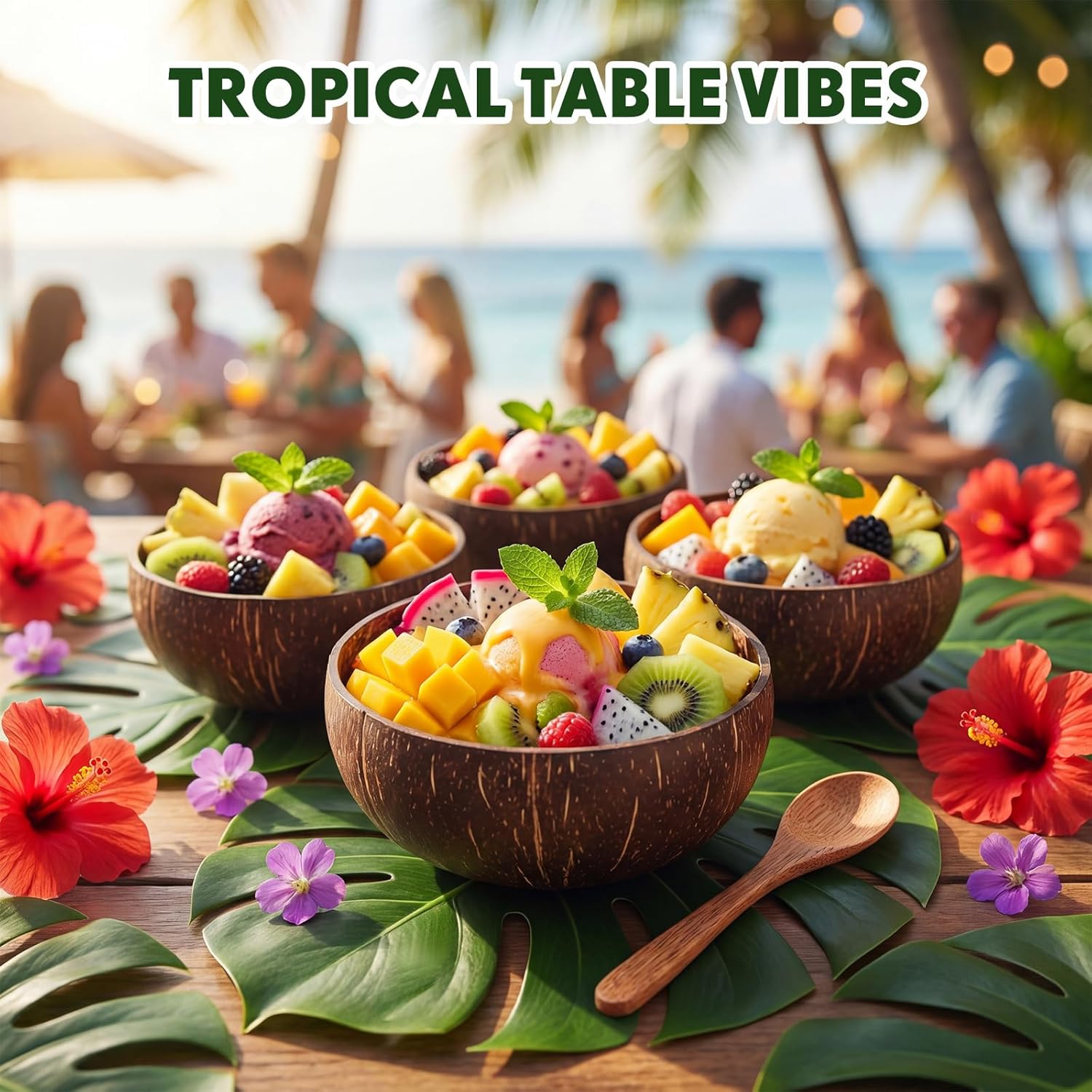 Features: Sustainable Design: Made from renewable coconut shells, these bowls provide a practical way to reduce single-use plastic waste. Each bowl features a unique texture that highlights its natural beauty, supporting a more sustainable lifestyle. Party Coordination: The monstera leaf plates and hibiscus flowers instantly elevate your table's visual appeal, helping you create a coordinated theme party display quickly. Whether hosting a Hawaiian luau, birthday celebration, or summer gathering Specifications: Material: coconut Color: brown Size: about 11-12 cm in diameter Package includes: 12 x Coconut bowls 12 x Spoons 12 x Palm leaf plates 12 x Hibiscus flowers Notes: Manual measurement, please allow slight errors on size. The color may exist a slight difference due to different screen displays