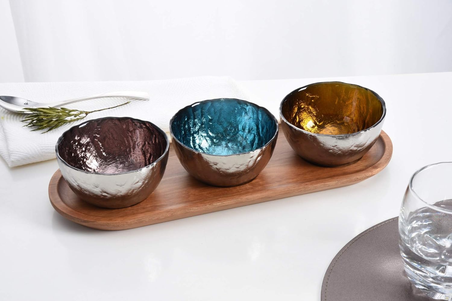 I CAN’T BELIEVE IT’S NOT METAL!!! Set of 3 colored glass bowls in yellow, purple and aqua with titanium outside on an acacia wood tray. Elegantly serve dips, spreads, candies, nuts or dried fruit in this bowl set. Striking titanium on the exteriors of these colored glass bowls reflect their textures into the bowls making each a striking element of the set. Use the bowls individually in a formal service or on the acacia wood tray for casual grazing. Food safe, Bowls only are dishwasher safe. Easy Care.