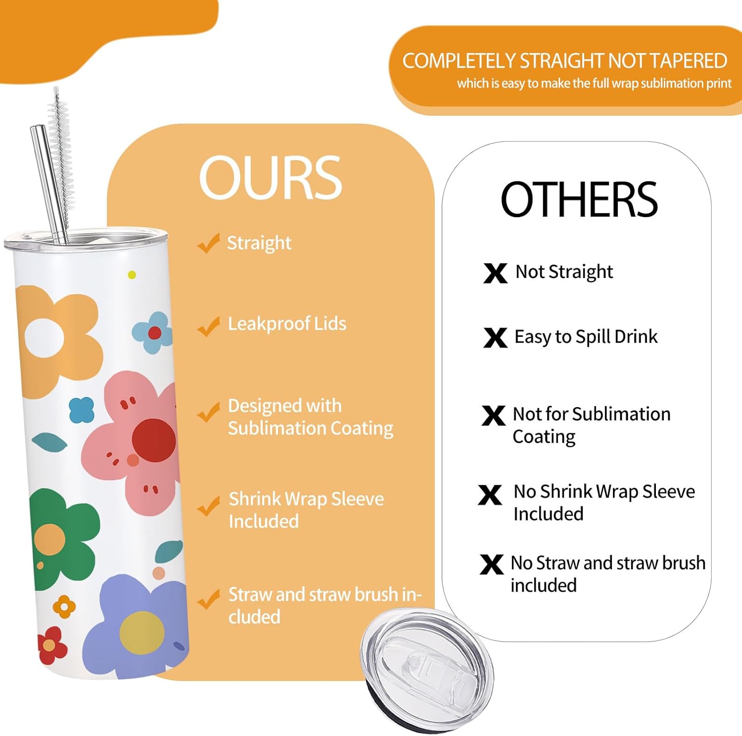Features:FUN DIYYou can add small signs such as name letters, logos, etc., on the surface of the stainless steel tumbler cup to make your own personalized tumbler. It is also a warm gift for anniversaries, Christmas, birthdays and other important day.Specifications:Material: 304 stainless steelColor: whiteCapacity: 20 Fluid oz Package includes:16 x Flat edge sublimation tumbler with lids 16 x Stainless steel straws 16 x Straw brush 16 x Shrink wrap sleeveNotes:Manual measurement, please allow slight errors on size.The color may exist a slight difference due to different screen displays.Please do not freeze or microwave.Please leave some space at top of vessel for lid to avoid overflow.Always keep the tumbler away from children when filled with hot liquids.
