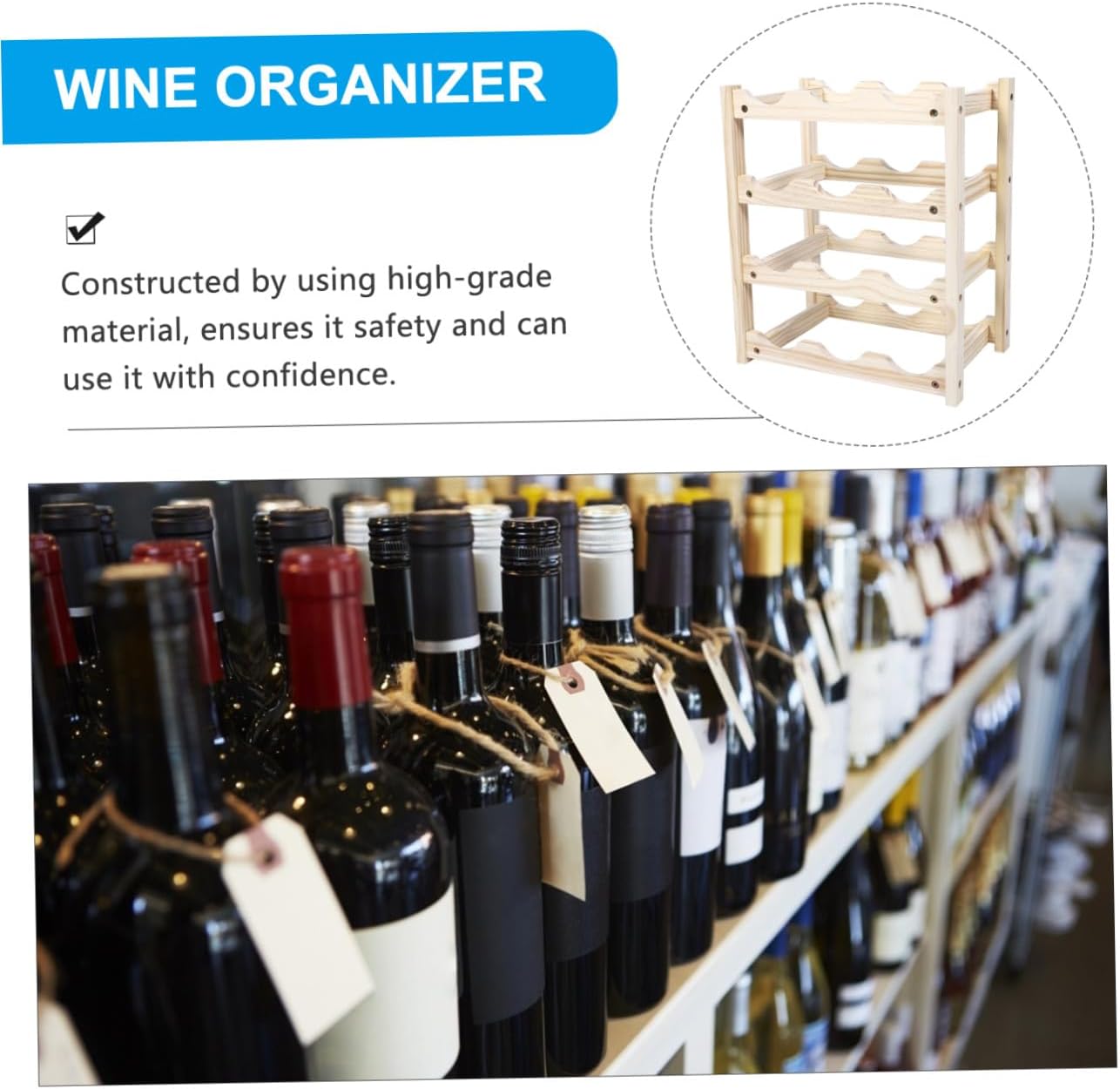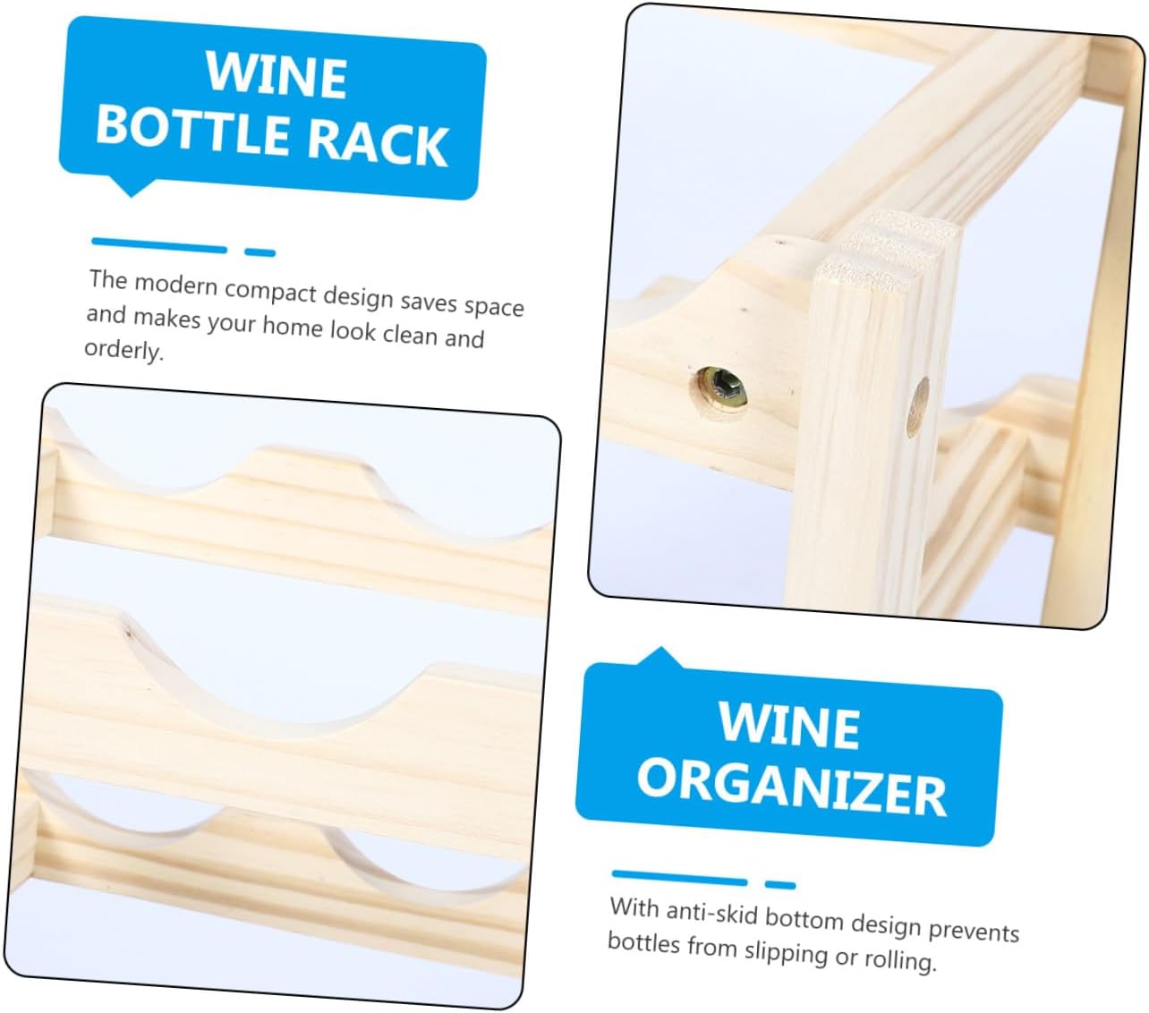 Package Include 1 x wine rack Characteristics - Size: 39.50X34.40X22.00cm/15.52X13.52X8.65inch Wine Bottle Stand. - Material: Wood Wine Storage Stand. - Constructed by using high-grade material, it safety and can use it with confidence Wine Bottle Rack. - ColorBeige Wooden Wine Stand - Suitable for home daily use, hotel desktop wine display, wine cellar use Decorative Wine Holder. - With anti-skid bottom design prevents bottles from slipping or rolling Wine Storage Bracket. - Secures bottles, cans, and sealed jars. Also be a wonderful decor for your house Wine Storage Holder. - Multi-layer style is designed for easily of wine bottles, cans, and jars Decorative Wine Rack.Goods InformationWine Storage Bracket Fine grinding, smooth surface, safe to the bottle.Household Adornment Suitable for home daily use, hotel desktop wine display, wine cellar use.Red Wine Holder This wine bottle storage rack has a stylish and elegant design with a fine workmanship which is a beautiful addition to the table or countertop in your kitchen, living room, dining room, or anywhere else in your home
