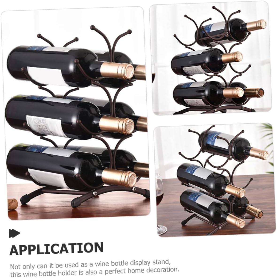 Package Include 1 x Wine Rack Features -Product Info:Red wine rack - Material:Iron - Size: 35.50X23.00X16.00cm/13.95X9.04X6.29in - This display stand is made of sturdy and stable iron material, sturdy and practical for longtime use. - ColorDark Brown - Detailed workmanship practicability and durability. You can use it with confidence iron wine bottle holder. - Not only can it be used as a wine bottle display stand, this wine bottle holder is also a perfect home decoration storage display rack. - It can be given as a to friends who like to collect red wine. They will like it very much wine rack tabletop. - This wine bottle holder is very suitable for homes, hotels, bars, restaurants, shops and other places wine holder stand.Goods Informationstylish wine bottle storage rack Tabletop wine bottle holder can display your wine more completely, and its creative and decorative shape also make it become a decoration for your home.metal wine storage organizer This simple wine display rack is manufactured with wear-resistant iron material, sturdy and practical for lasting use