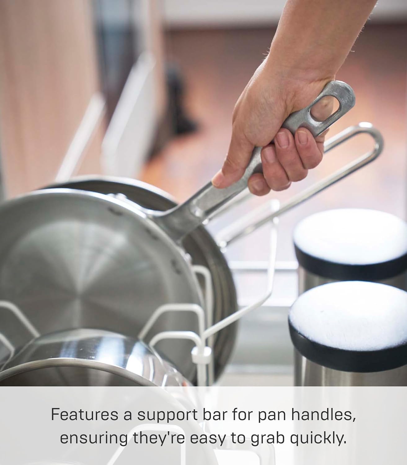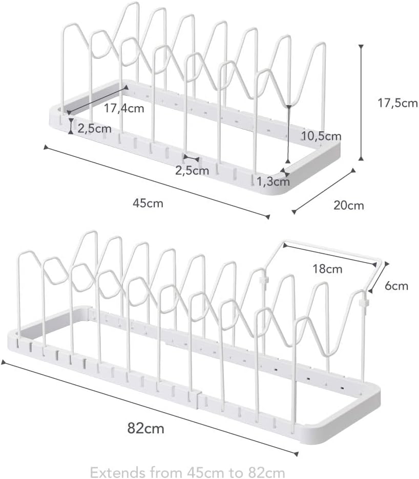 The Tower Adjustable Lid & Pan Organizer by Yamazaki accommodates any size pot lid or pan that your kitchen can throw at it. Expand as necessary and set the support frames to be as close or as far apart as needed. An extra support bar is included to lift pan handles. Brand StoryYamazaki has been bringing inspired ideas to common household items for over 100 years. Yamazaki brings thought and creativity to everyday items through design inspired by life in Japan. Life in Japan, and any city, leaves residents short on space. With this, they focus on organization, storage and space-saving. Each of their products are designed to be as smart and simple as possible. Driven by a sense of curiosity and creativity, they believe that better home goods make for a better home life. YAMAZAKI Product lines: TOSCA: A Scandinavian-inspired line of storage essentials in warm white steel with wooden accents. TOWER: Clean lines and modern design define this line of functional home goods. All products are available in black and white. RIN: A line of simple organizational tools with a modern edge and wood panel accents.