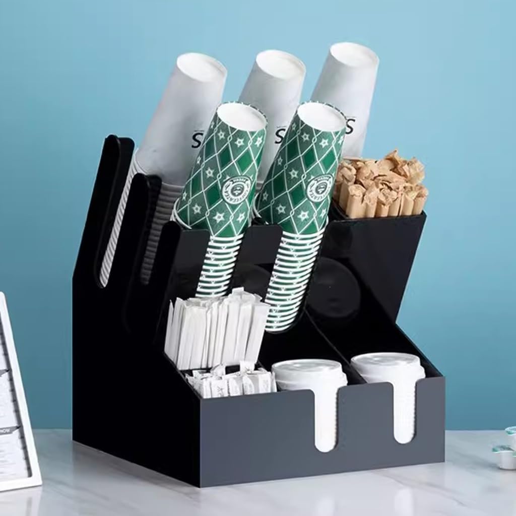 Coffee Condiment Organizer Lid Holder for Countertop Stylish Bar Accessories Perfect Home and Office Use Storage Cups Lids,Introducing our versatile Coffee Condiment Organizer, designed to elevate beverage stations and break rooms with a tidy and efficient storage solution. This essential accessory is perfect for homes, offices, cafes, and more, ensuring that your space remains organized and clutter-free while providing easy access to all your coffee essentials. **Product Features** 1. Ideal for cups and lids with a diameter of up to 10cm (3.9 inches). 2. Constructed from durable acrylic, this organizer boasts a tiered, compartmentalized design featuring 10 spacious compartments. Perfectly store paper cups, lids, straws, stirrers, creamers, sweetener packets, and more. 3. Convenient and user-friendly, this organizer is suitable for various settings, including homes, offices, waiting rooms, and reception areas. **Product Details** - **Product Name:** Disposable Cup Holder - **Material:** Acrylic - **Color:** Black - **Dimensions:** 32.5*31.5*37cm (12.4*12.8*14.6 inches) - **Target Audience:** Suitable for everyone - **Usage:** Ideal for home decoration, kitchens, cabinets, pantries, cafes, bars, and more. - **Key Features:** Safe, practical, sturdy, and durable. **Shipping Includes:** Coffee cup holder *1 (other items are for display purposes only). Please note that we only sell the Cup Holder, and other decorative items are not included. Minor measurement variations of 1-2cm may occur due to different measuring methods. Color discrepancies might arise from lighting and monitor settings, which is completely normal.