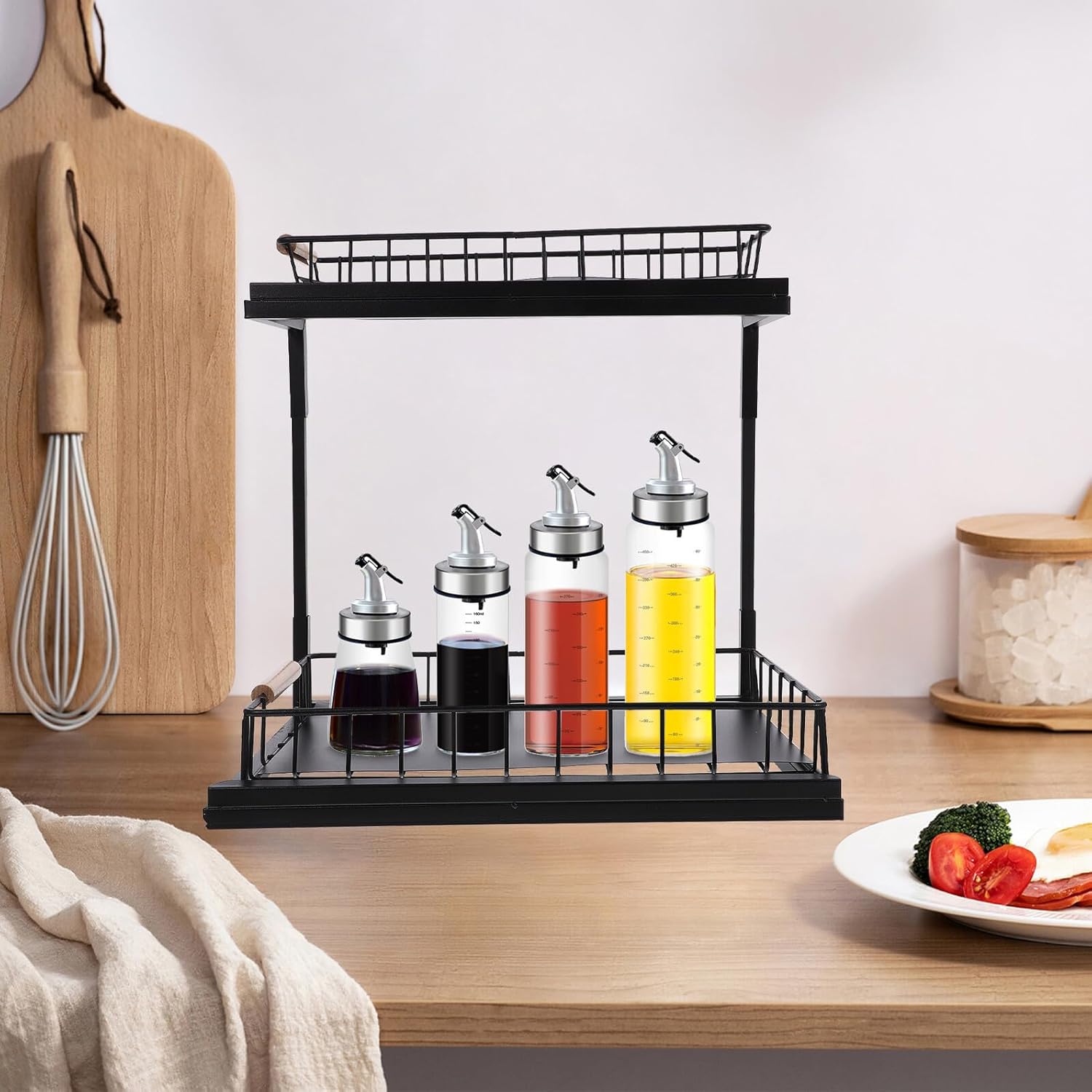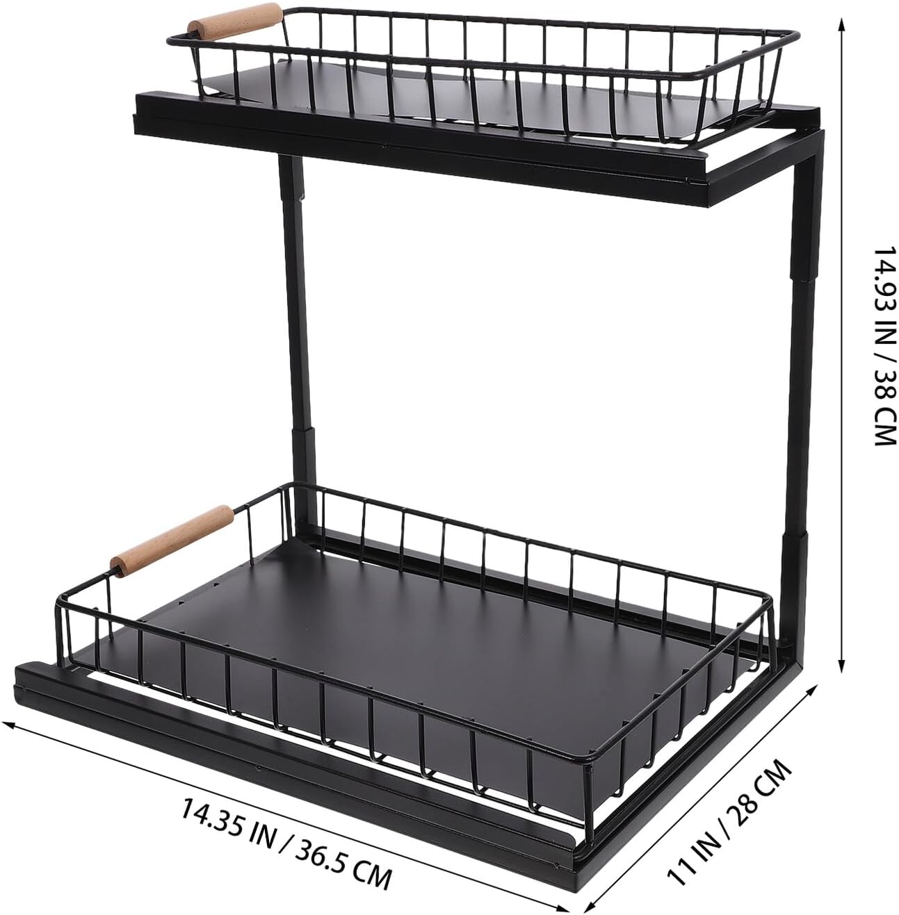 Package List 1 x Under Sink Organizer Characteristics - Color: Black -Product Info:Seasoning rack storage rack - Size: 38.00X36.50X28.00cm/14.93X14.34X11.00in -Material:Carbon steel - The storage rack is made of carbon steel material and with good process, not easy to break or crack, to use. - It has a wide range of application, suitable for kitchen countertop, under sink, cabinet and so on under sink storage rack. - Versatile design for organizing and storing kitchen items under the sink or in cabinets pull out spice rack. - With sliding design, it allows you to easily access the item you need in the cabinet, very convenient to use under sink organizer pull out. - With 2 tier design, the storage rack has enough capacity, which can meet your different storage needs kitchen sink organizer under cabinet.Goods Informationshelf organizer Dual-layer design, carbon steel material, steady structure, it must meet your needs to store seasoning bottles in kitchen, soap, shampoos, cleanser in bathroom, etc.pull out storage If you are looking for a multifunctional storage rack, our organizer rack is sturdy and trustworthy enough to do multiple jobs