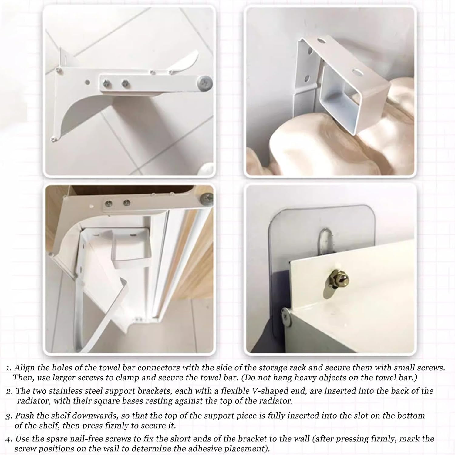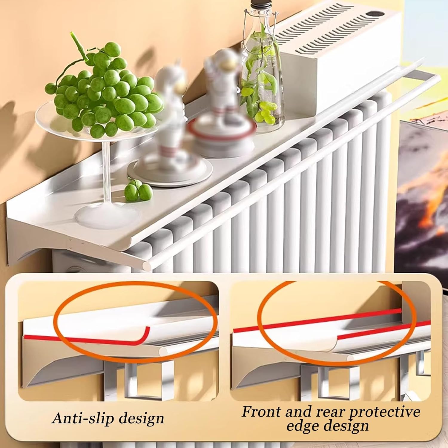 JKGHK Our radiator covers are engineered to help improve heat circulation in your room. They allow warm air to flow more freely, creating a more evenly heated environment.Radiator covers not only keep your belongings organized but also act as a smoke barrier, effectively preventing smoke and dust buildup and eliminating dust from settling on your radiator.No drilling required. Simply insert the included bracket into the gap between the radiator and the wall, then place the radiator cover on the bracket. Product Name: Radiator Cover/Radiator Shelf/Shelf Over Radiator/Radiator Top Shelf/Heating Cabinet Storage ShelfMaterial: MetalStyle: Simple and modernColor: WhiteIs assembly required: YesDimensions: Available in various sizes; please measure your radiator before purchasing.Function: Insulation, dust protection, storageApplicable scenarios: Living room/balcony/office/bathroomPackage Content:- 1 x Radiator Shelf (excluding decorations)Notice:1. Due to manual measurement, please allow 1-3 cm error.2. Due to factors such as light and display, the actual item received may be different from the picture. Please refer to the actual product.3. We only have Radiator Shelf, other products are only used as scene props for reference.