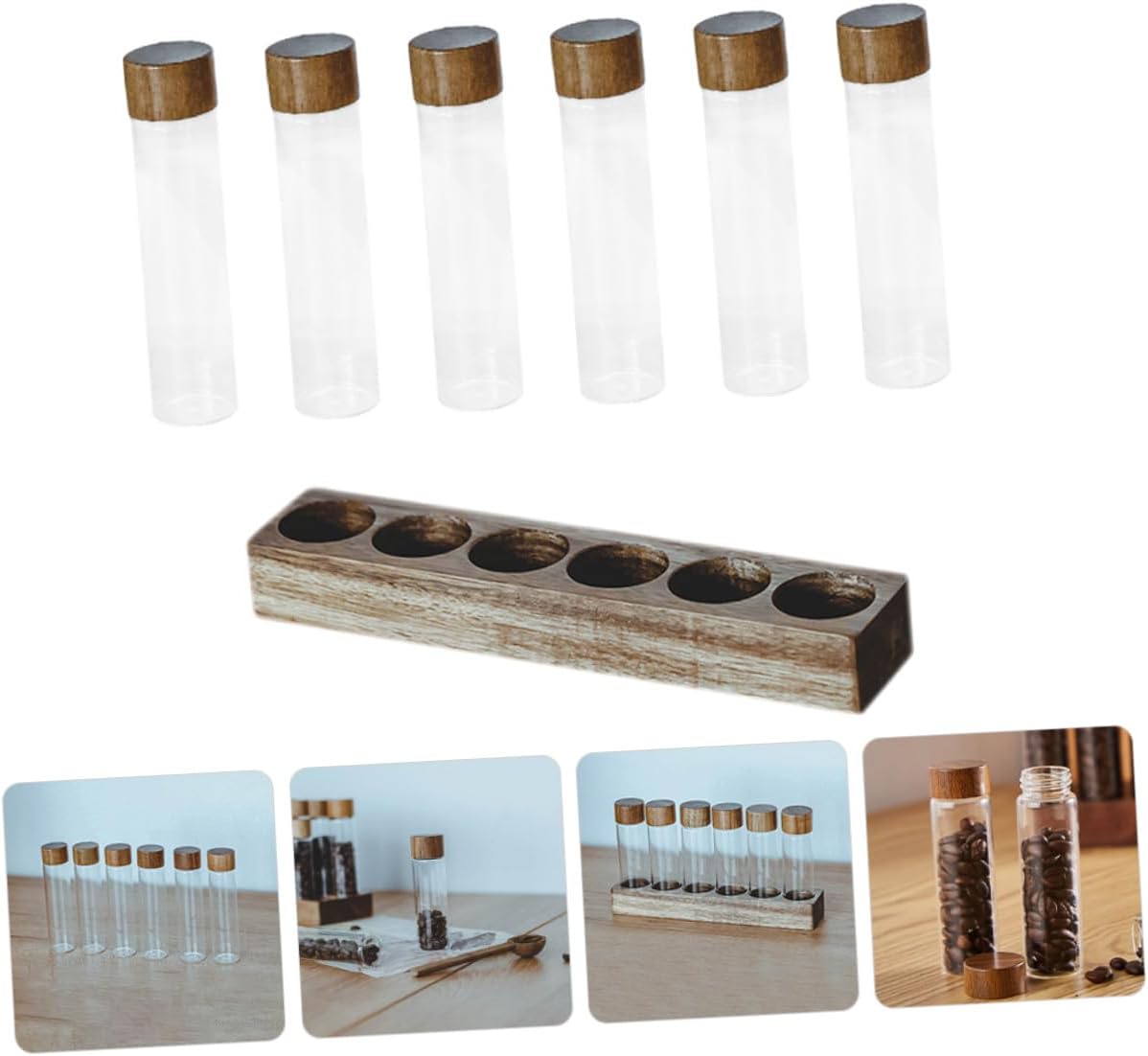 Package Include 1 x Wooden Base 6 x Coffee Bean Storage Tubes Features -Size:12.50X3.00X3.00cm/4.91X1.18X1.18in(Glass Tube) -Material:Glass, wood -Product Info:Coffee bean storage jar -Color:As shown -Size:21.30X4.50X2.70cm/8.37X1.77X1.06in(Wooden Base) - The glass display stand and sealed can make it easy to organize and store your coffee beans tubes coffee bean display. - The sealed storage tubes can lock in the freshness and aroma of your coffee beans coffee canisters. - The test tube bottle can be easily removed for convenient access to your coffee beans coffee bean storage with stand. - Compact design, the single tube design takes up minimal space, making it suitable for small kitchens or apartments Coffee Beans Storage Tubes. - Made of good wood and glass materials, this coffee beans storage set is and sturdy, ensuring long-term use.Goods DescriptionSealed Airtight Coffee Bean Canisters This kind of storage ornament, made of glass and wood materials, safe and convenient to use.coffee vials Are you looking for a storage container for your home to store coffee beans? If you are, then come to see these storage containers that we have already prepared for you