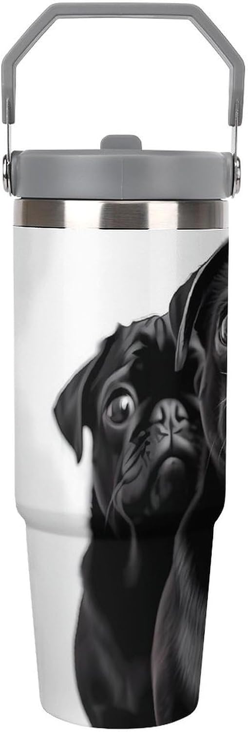 Our Cute Black Pug Dog travel water bottle is made of food-grade stainless steel. The wide mouth design makes it easy to clean and add ice, and the powder-coated exterior is non-slip and durable, ensuring driving safety.Whether you prefer sipping or quenching your thirst, this personalized insulated mug has you covered. Featuring a splash-proof straw design, a sealing ring securely holds the reusable straw, and a drinking spout and full-coverage lid for enhanced leak-proof performance, this mug allows you to easily carry ice water to work, meetings, the gym, or on trips.You can give it to your friends and family as a birthday, Mother's Day, Father's Day, New Year's, Thanksgiving, and holiday gift. It's a thoughtful present.