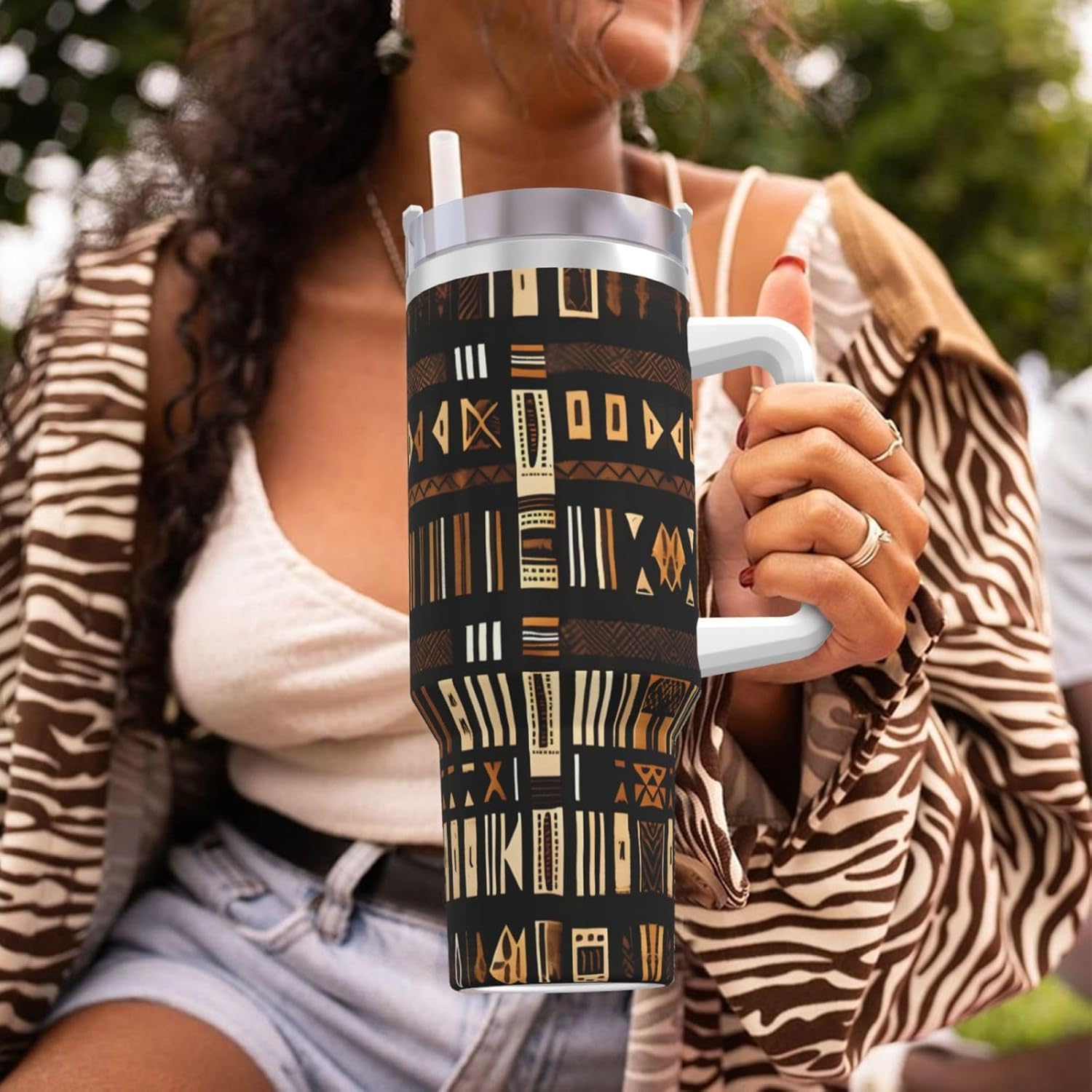This African Mud Cloth Tribal Print Ice Bully Cup features a double layer stainless steel design that can be used for a long time without rusting. The lid has good sealing to prevent water from overflowing, and it is easy to unscrew for filling and cleaning. It can keep water, coffee, or drinks warm or cool for hours and is suitable for travel, camping, and driving.