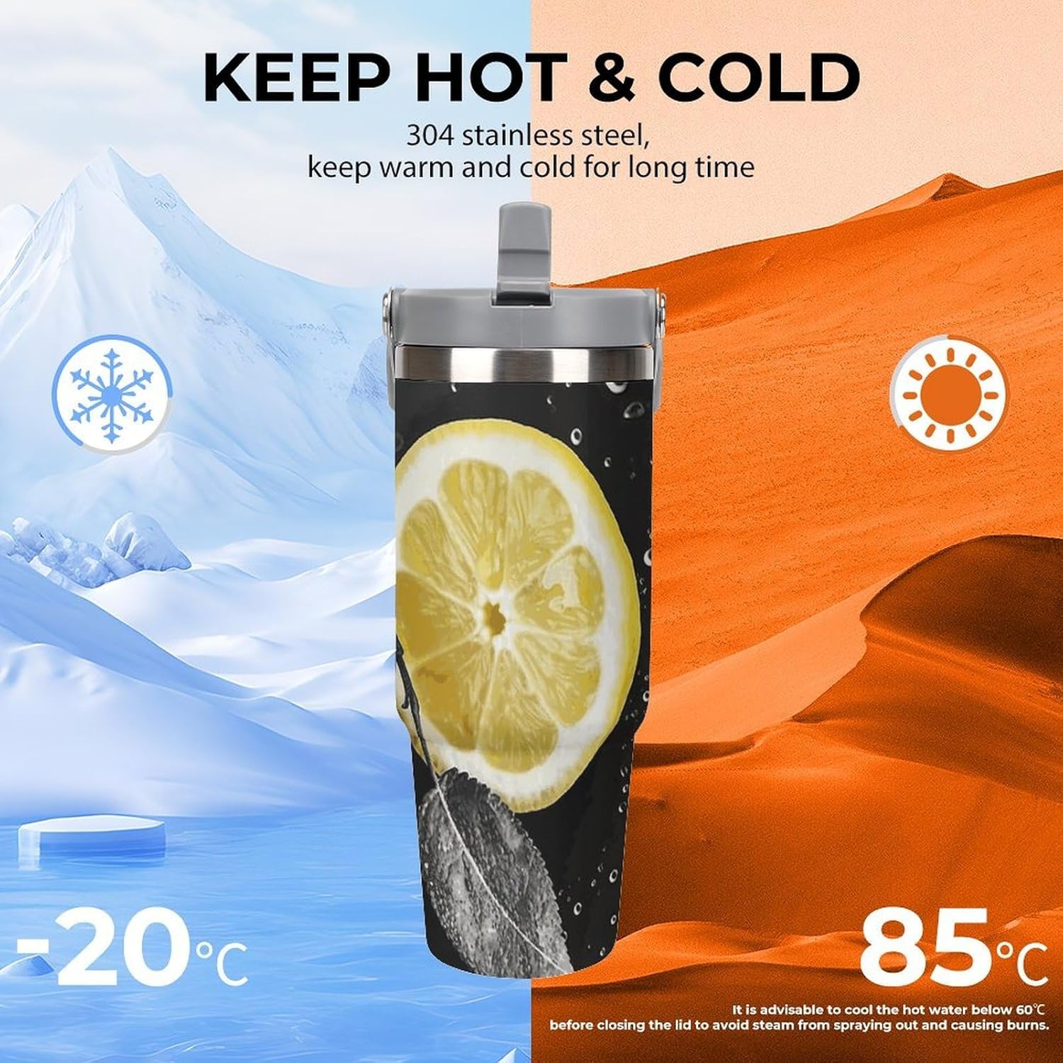 Our Lemon with on Black And White travel water bottle is made of food-grade stainless steel. The wide mouth design makes it easy to clean and add ice, and the powder-coated exterior is non-slip and durable, ensuring driving safety.Whether you prefer sipping or quenching your thirst, this personalized insulated mug has you covered. Featuring a splash-proof straw design, a sealing ring securely holds the reusable straw, and a drinking spout and full-coverage lid for enhanced leak-proof performance, this mug allows you to easily carry ice water to work, meetings, the gym, or on trips.You can give it to your friends and family as a birthday, Mother's Day, Father's Day, New Year's, Thanksgiving, and holiday gift. It's a thoughtful present.