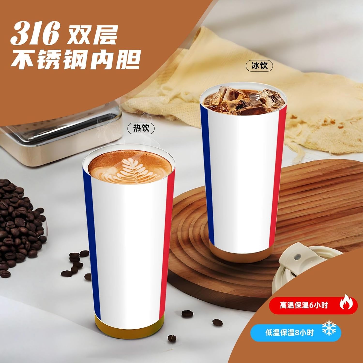 French flag Experience the ultimate blend of style and functionality with our uniquely designed coffee mug. Perfectly suited for those who appreciate individuality, this 16 oz tumbler features a full-print, customized design that sets it apart from ordinary mugs. Made from top-grade 316 stainless steel on the inside and 201 stainless steel on the outside, along with a PP lid and straw, this mug is not only stylish but also incredibly durable.The superior insulation keeps your drinks at the desired temperature for more than 12 hours, ensuring you can enjoy your coffee, tea, or any other beverage no matter the weather. The ergonomic, tapered shape of the mug provides a comfortable and firm grip, making it easy to handle and carry. Whether you're on the go, relaxing at home, or working in the office, this versatile tumbler is the perfect companion.Additional features include a dual-drink lid, a convenient straw, and a sturdy nylon wrist strap for portability. The non-slip base adds an extra layer of security, keeping your drink stable on any surface. For cleaning, simply wash with water or wipe down; avoid using bleach or a dishwasher. Note that due to different measurement methods, a slight variation of 1-3 cm in size is considered normal.Make a statement with our unique, customized coffee mug, and elevate your drinking experience today!