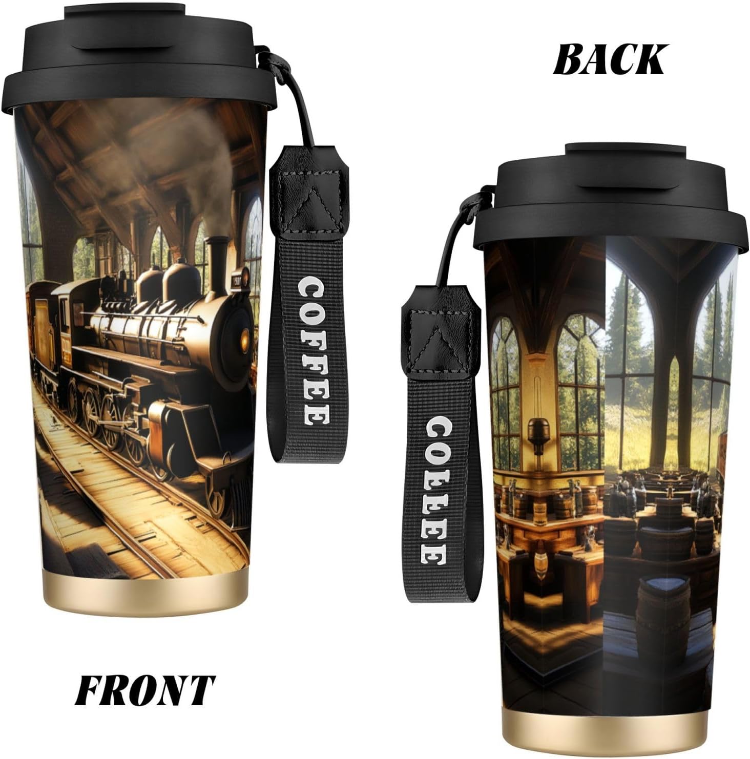 Mystery Train Experience the ultimate blend of style and functionality with our uniquely designed coffee mug. Perfectly suited for those who appreciate individuality, this 16 oz tumbler features a full-print, customized design that sets it apart from ordinary mugs. Made from top-grade 316 stainless steel on the inside and 201 stainless steel on the outside, along with a PP lid and straw, this mug is not only stylish but also incredibly durable.The superior insulation keeps your drinks at the desired temperature for more than 12 hours, ensuring you can enjoy your coffee, tea, or any other beverage no matter the weather. The ergonomic, tapered shape of the mug provides a comfortable and firm grip, making it easy to handle and carry. Whether you're on the go, relaxing at home, or working in the office, this versatile tumbler is the perfect companion.Additional features include a dual-drink lid, a convenient straw, and a sturdy nylon wrist strap for portability. The non-slip base adds an extra layer of security, keeping your drink stable on any surface. For cleaning, simply wash with water or wipe down; avoid using bleach or a dishwasher. Note that due to different measurement methods, a slight variation of 1-3 cm in size is considered normal.Make a statement with our unique, customized coffee mug, and elevate your drinking experience today!