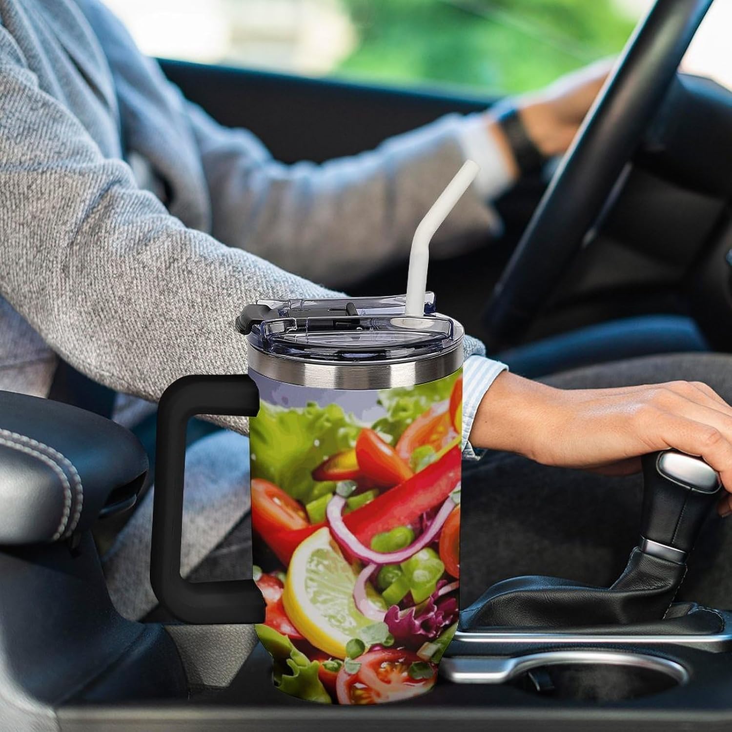 40 Oz Insulated Mug with Handle, Stainless Steel Colorful Various Salad Printed Travel Mug Portable Leak-proof Large Car Mug for Home, Office Or Car