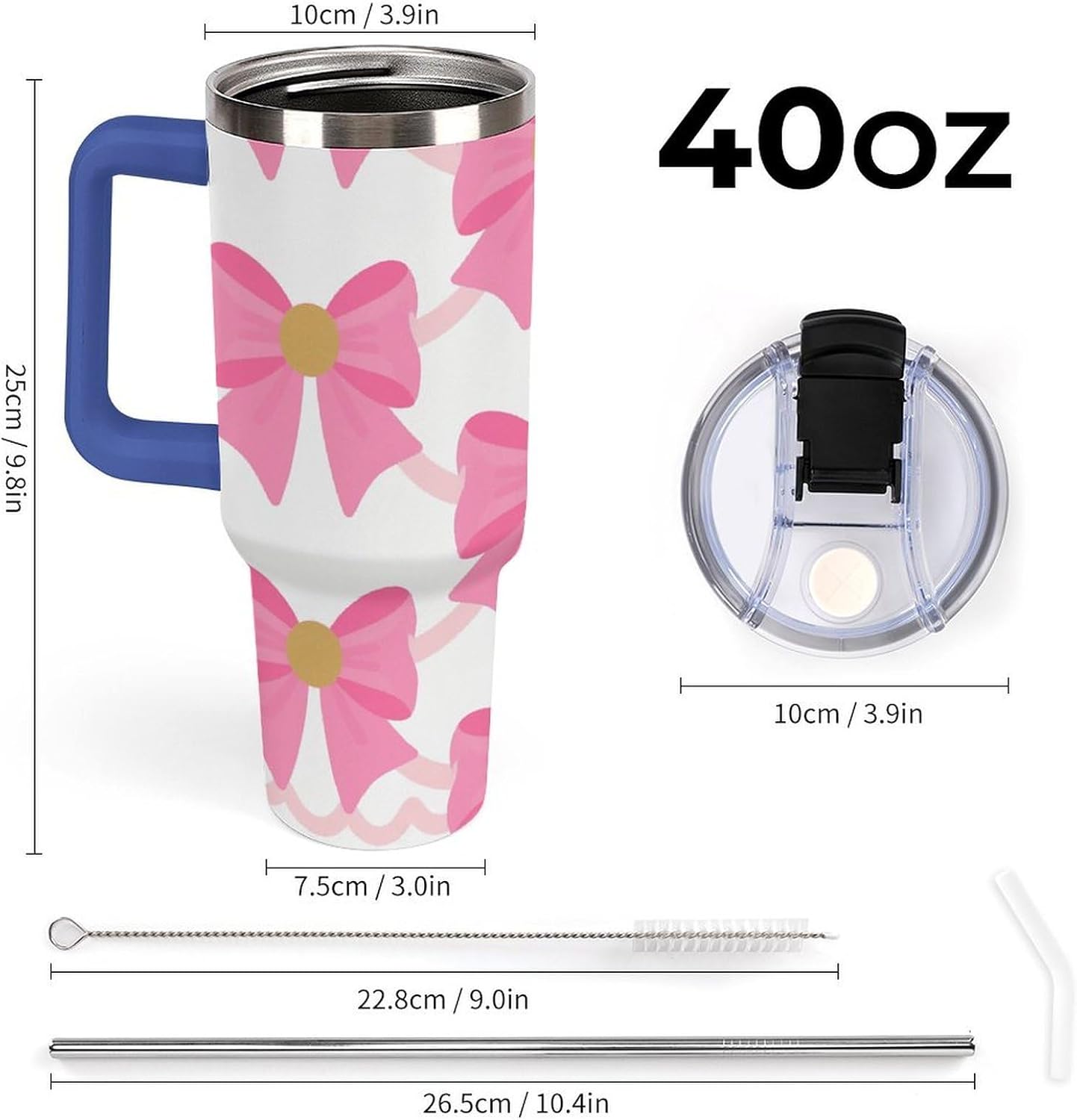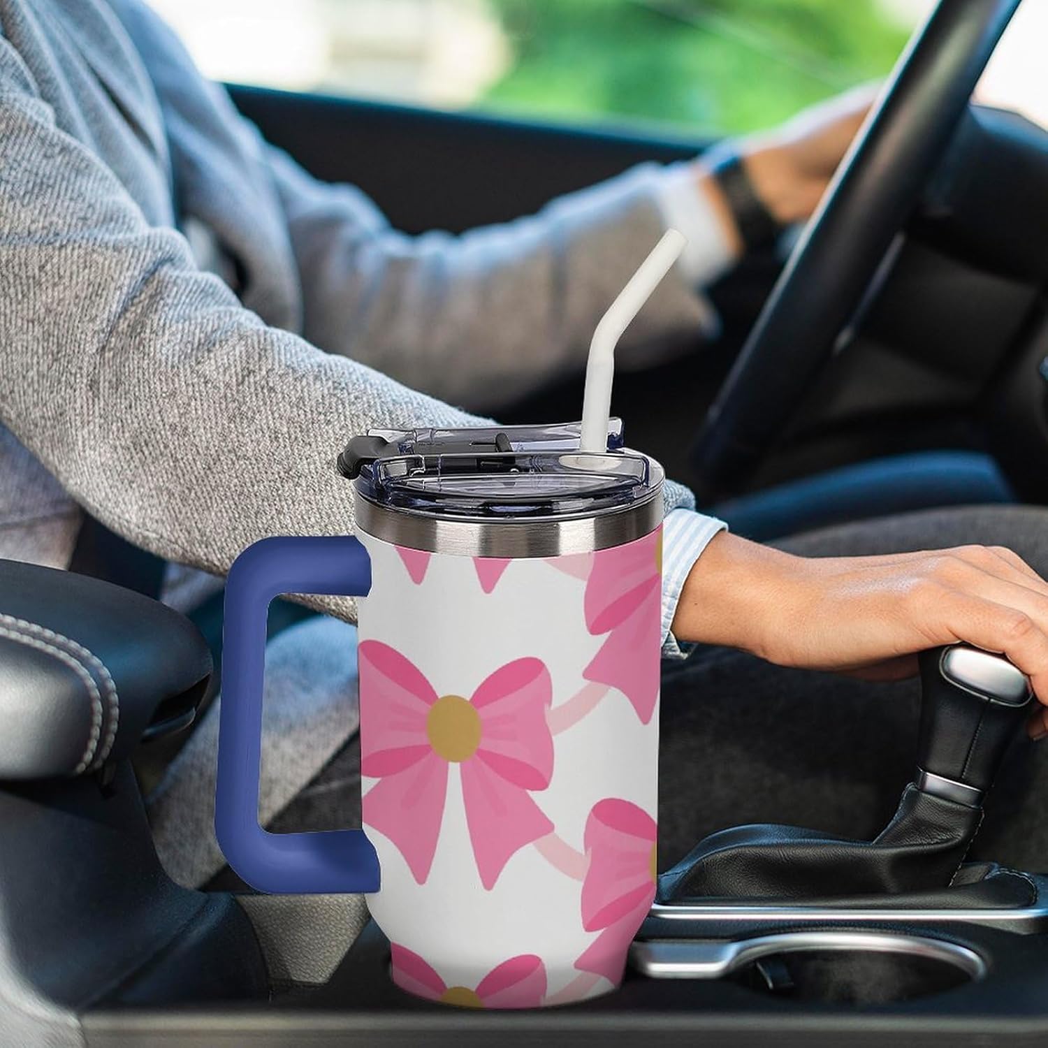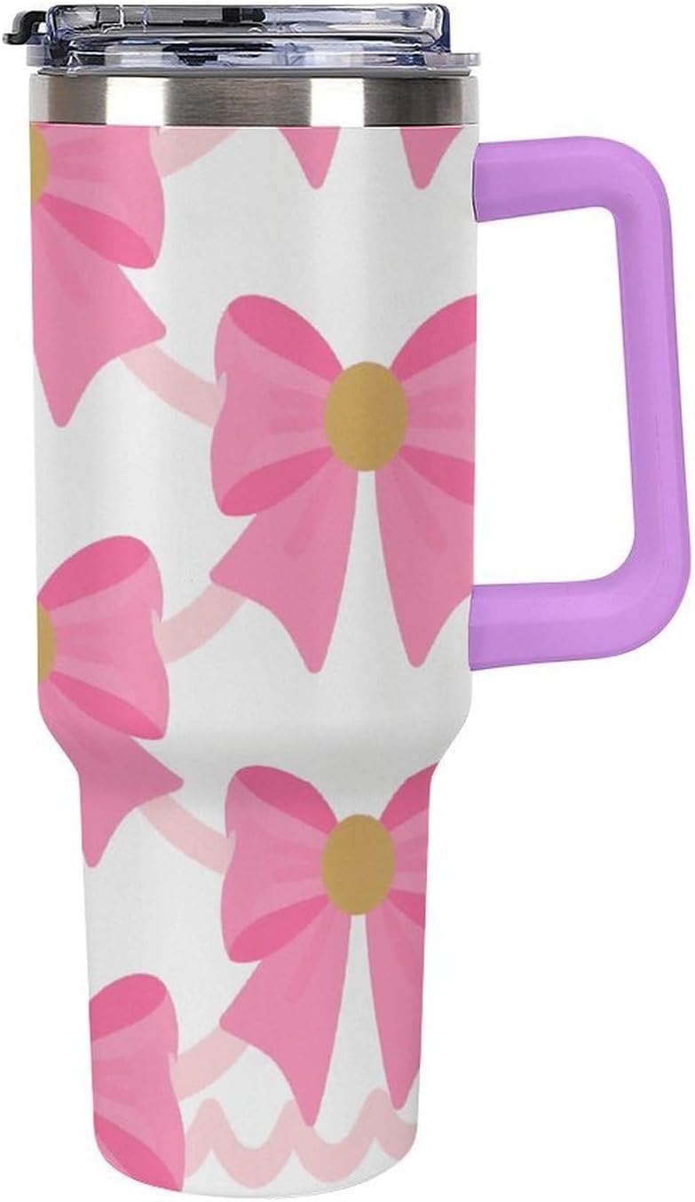 Stainless Steel Car Cup Large Capacity Tumbler 40oz Insulated Mug Big Reusable Water Bottle Iced Coffee Cup for Women Portable Thermos for Travel Cup Holder Friendly Water Cups with Straw Double Wall Insulated Cup Easy Clean Tumbler Leakproof Travel Cup Fits Cup Holder BPA Free TumblerMeet your new favorite on-the-go companion - the 40oz Stainless Steel Tumbler, designed for durability, convenience, and everyday use.Premium 304 Stainless Steel & Insulation:Crafted from high-quality 304 stainless steel, this Pink Bow travel mug features double-wall vacuum insulation that maintains your beverage's temperature for extended periods.The Leakproof Dual Lid Offers Two Drinking Options:Use the included stainless steel straw for easy sipping, or choose the direct sip opening. Made without BPA, the lid seals tightly to prevent accidental leaks in your car, bag, or at home.Large Capacity & Fits Cup Holder:With a large 40oz capacity, this Pink Bow water bottle is perfect for long drives, workdays, outdoor adventures, and daily errands. Its tapered shape fits securely in most car cup holders, and the weighted, non-slip base helps avoid spills when the road gets bumpy.Comfortable Handle:The comfortable grip means you can take it everywhere without hassle. Whether you're relaxing at home or heading out to the gym, it's got your back!Complete Set with Straw & Cleaning Brush:A reusable stainless steel straw, a plastic straw tip tube, a leak-proof silicone, and a soft bristle brush to keep your straw and lid fresh.Ideal for commuting, travel, gym, office, or home - this versatile tumbler supports a hydrated, active lifestyle wherever you are.