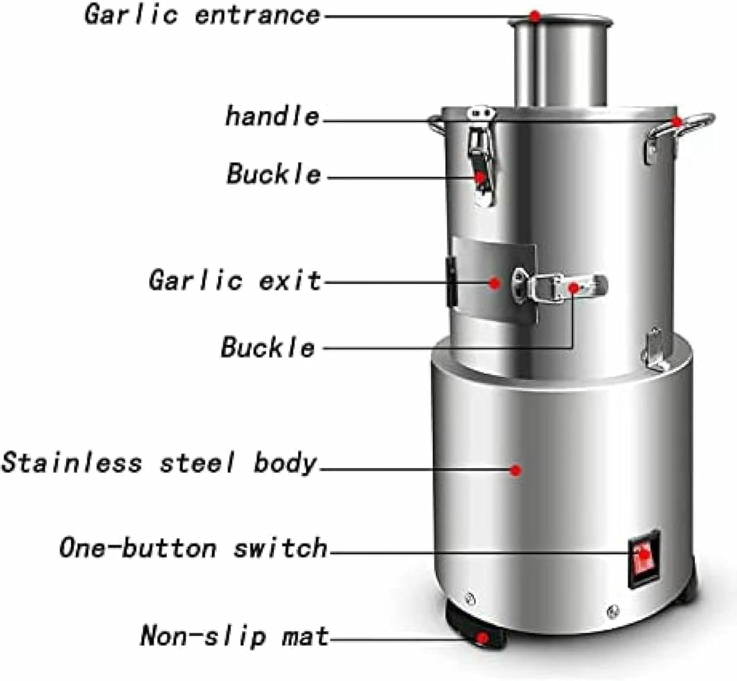 1. High-power motor for fast garlic peeling2. Thickened stainless steel body for durability3. Whole garlic peeling separator for fast garlic peeling4. Automatic separation of garlic heads without breaking them apart5. Large radiator for longer working time and higher stability6. Simple operation, saving time and effort Specifications:Name: Whole garlic peeling machineColor: steelMaterial: stainless steelMachine size: 24*24*48cmPackaging size: 54*31*31cmNet weight: 8.5kgMotor power: 200WEfficiency: 30kg/hPeeling rate: 98% Packing list:Garlic peeling machine x 1 Please note:This machine is designed for dry garlic, which is best divided into granules and dried in the sun for best results.The peeling rate of red garlic, purple garlic, and garlic with skin may be lower.Wet garlic and fresh garlic cannot be peeled with this machine. About damage:During the peeling process, some garlic may be slightly damaged.Not suitable for commercial market, best for personal use in hotels, barbecue shops and western restaurants.Users with high requirements should purchase with caution, thank you for your understanding!Upgrade your garlic peeling process with this efficient and durable whole garlic peeling machine.