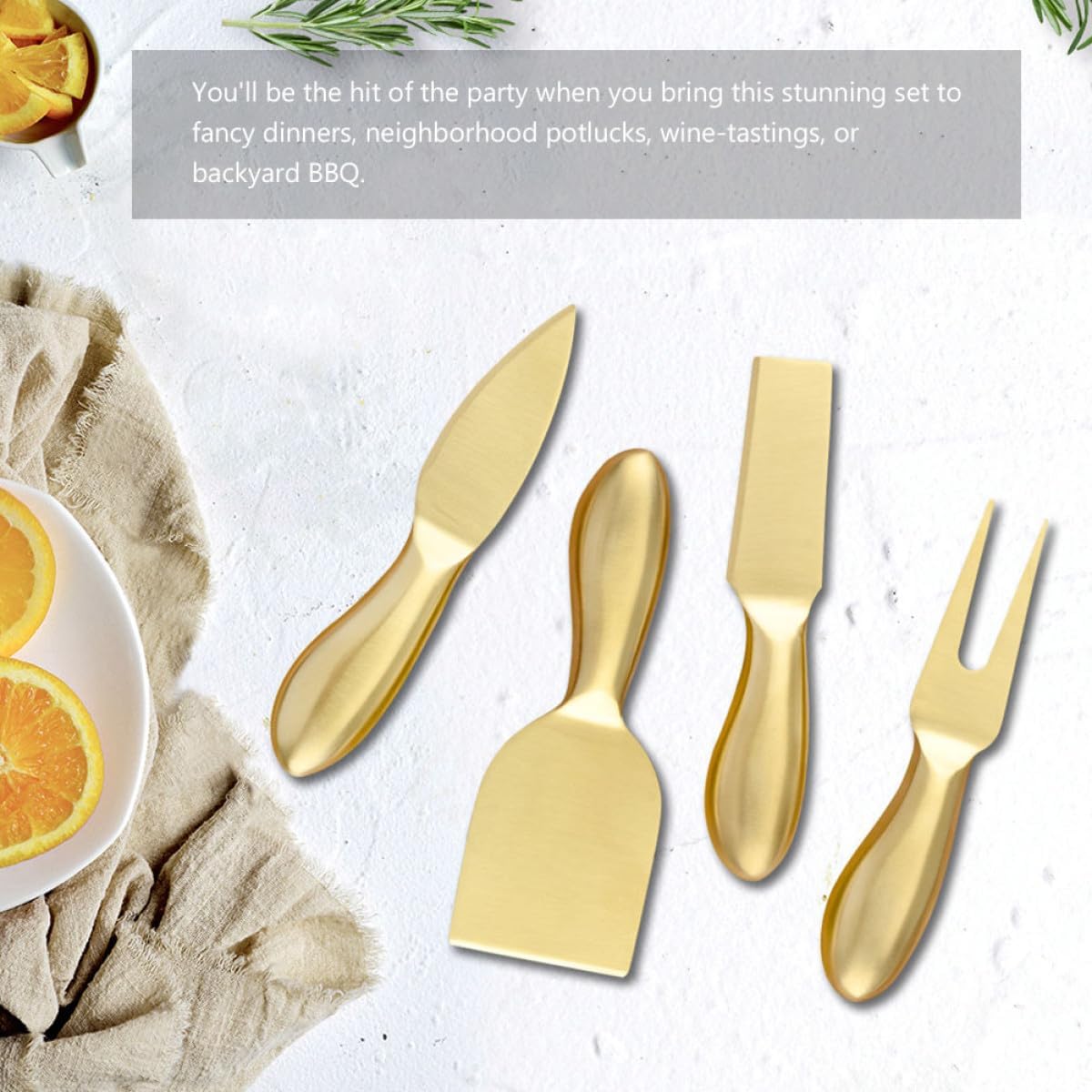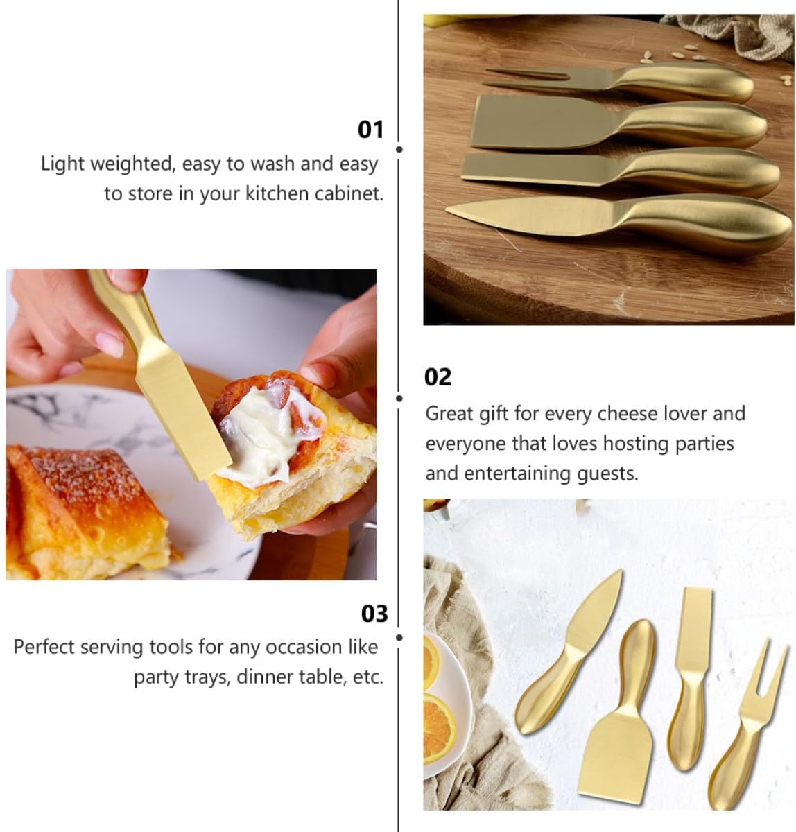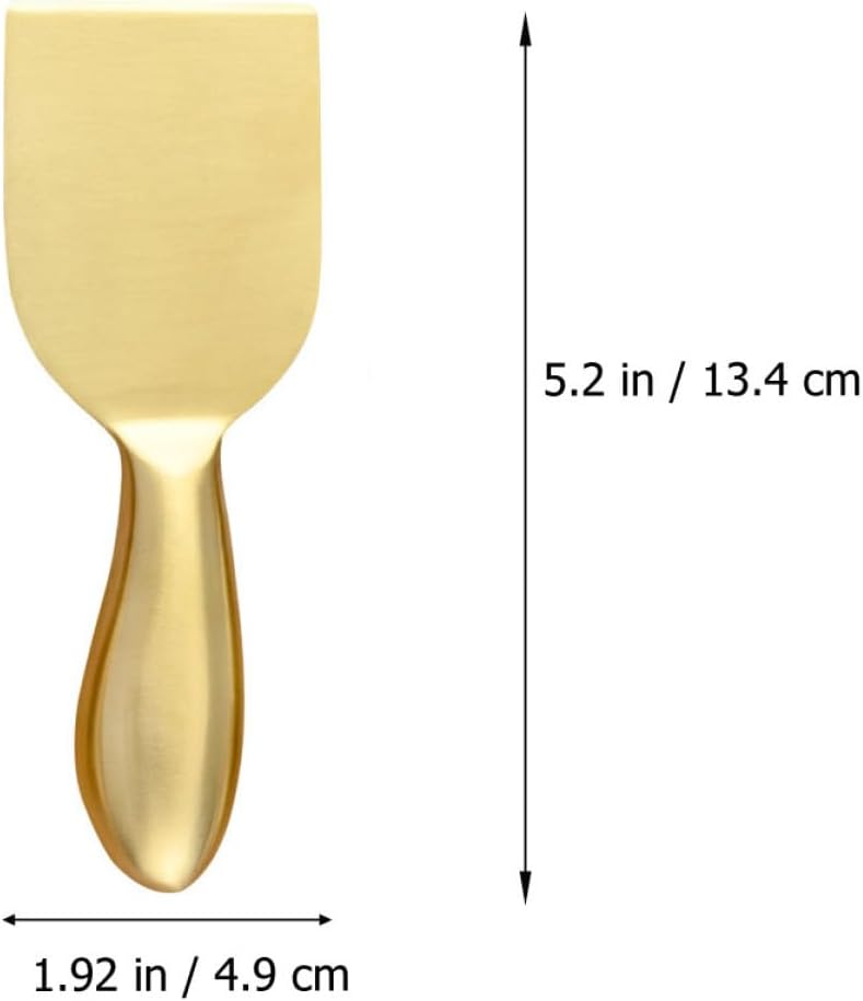Package List 1 x cheese spatula 1 x square cheese cutter 1 x heart-shaped cheese cutter 1 x cheese fork Features - Color: Golden. - Material: Stainless steel - Size: 13.40 x 4.90 x 3.00cm/ 5.27 x 1.93 x 1.18 inch. -Product Info:Cheese knife - You can cut, hold, slice, spread and serve any kind of cheese easily and without difficulty. This cheese cutter is washable in any kind of way Butter Cutter Fork Kit. - It is produced with than other cheese cutter sets. Because other ordinary cheese knives can break after a few uses and leave water stains after washing the product. This set of cheese cutter is manufactured to solve all these problems. You can use with peace of mind Cheese Cutter Kit. - Cheese cutter set made of professional measure stainless steel and handle is perfect for use Cooking Tools. - A mini spade cutter for cutting hard cheese, a mini fork to chuck cheese, a narrow plane cutter to slice semi-hard cheese and cheese, and a spreading cutter for cheese. - The rugged and ergonomic design of stainless steel blades balanced and safe handling for slicing, cutting, spreading and serving and hard cheeses.Goods InformationStainless Steel Cheese Cutter Perfect serving tools for any occasion like party trays, dinner table, etc.Slicer Kit and ! Great to hold, cut, break, slice and shave any type of cheeses.Cooking Tools They are made of stainless steel with handles that are easy to grip.Butter Cutter Fork Kit Each cutter is ergonomically designed and in style with easy grip handles.Kitchen Cheedse Cutter Easy to wash and easy to store in your kitchen cabinet