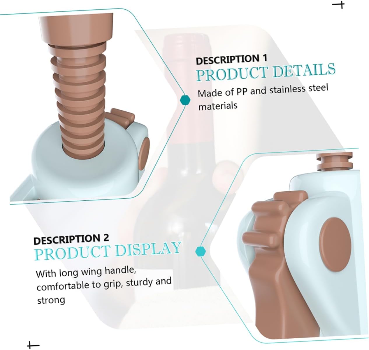 Package List 1 x wine corkscrew Features -Color: Sky-blue Wing Wine Opener. -Material: PP, stainless steel Wine Bottle Wing Opener. -Size: About 19.00X7.00X7.00cm/7.47X2.75X2.75inch Wing Wine Corkscrew. -The cross shape wine bottle opener has high strength, is easy to drilling the cork stopper Wing Stopper Opener. -With bright color and good texture, not easy to damage and crack, can serve you long time Wine Opener. -Made of PP and stainless steel materials, the fine workmanship ensure the excellent durability and practicality Wing Stopper Corkscrew. -Great wine opener for home, restaurant, winery, party, banquet, families gathering, etc Stainless Wing Corkscrew. -With long wing handle, comfortable to grip, sturdy and strong, make it opens the bottle more stable Wine Stopper Opener.Goods DescriptionStainless Wing Opener Are you looking for wing wine opener? If yes, then our product will be a good choice for you.Wing Wine Corkscrew This is wine bottle opening tool is light weight and portable, made of PP and stainless steel material, durable and practical to use.wine corkscrew With bright color and creative design, cross screw rod design make it easier to opening the wine bottle